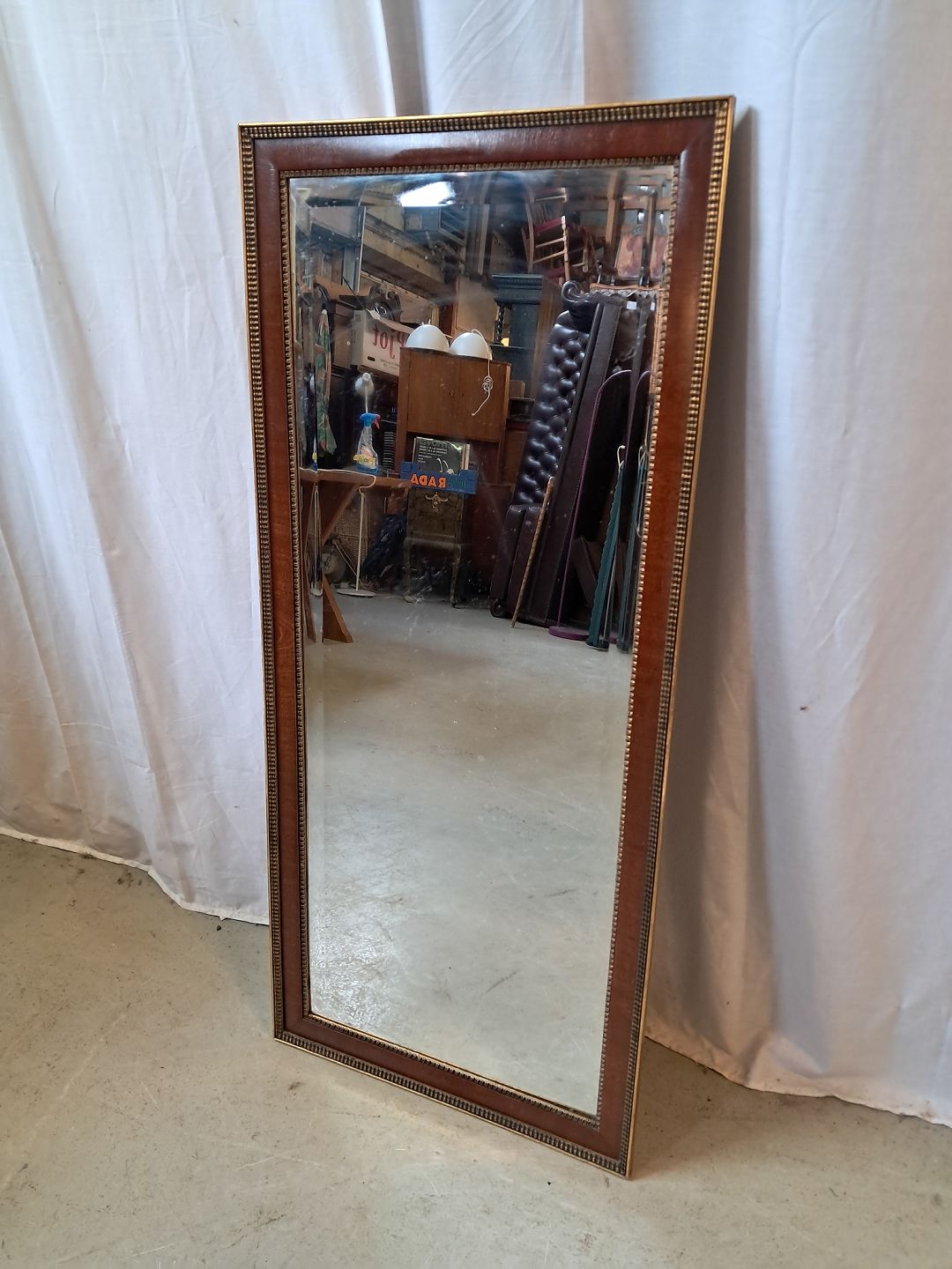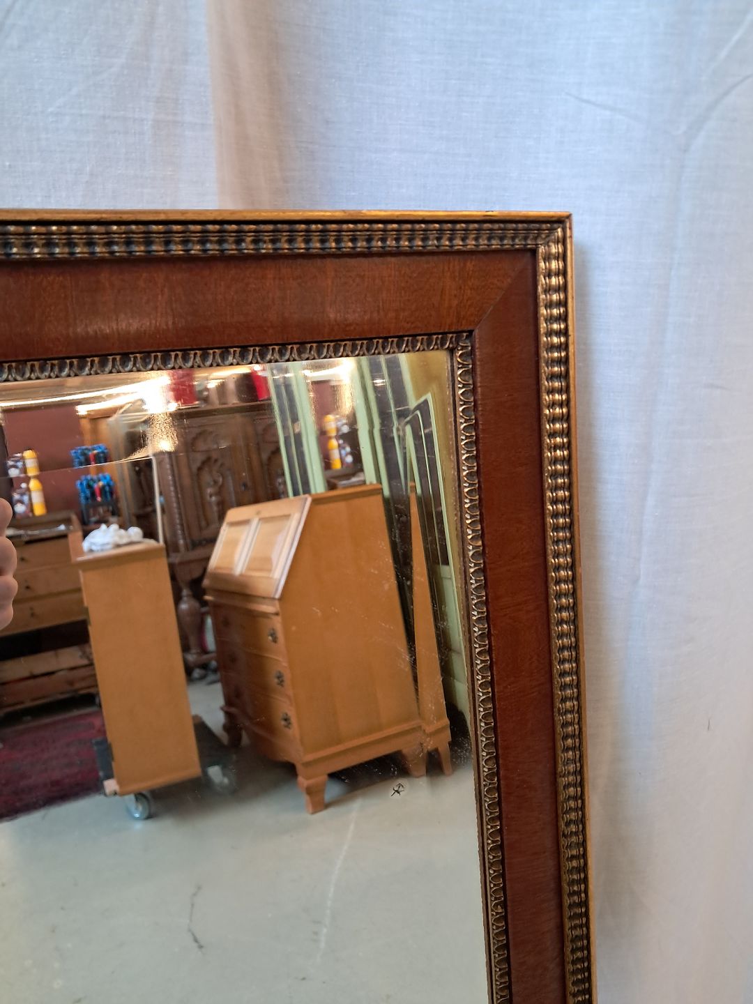 Spejl i fineret mahogni med guldmaling, fra 1950erne. Det har brugsspor. Højde 113cm Bredde 51cm Emne nummer: 77786