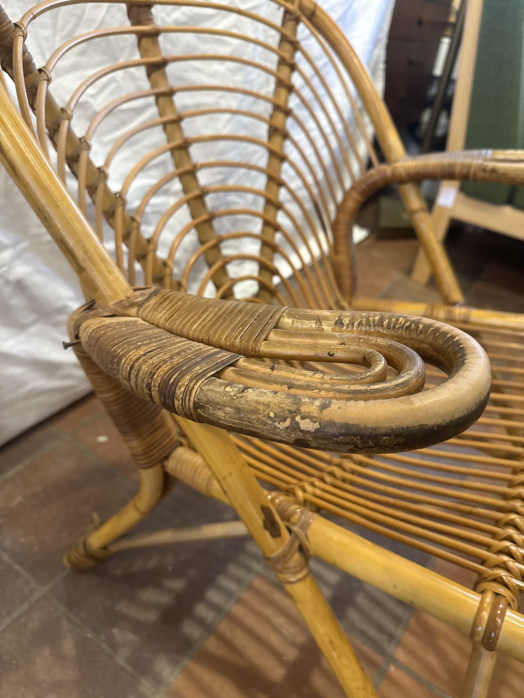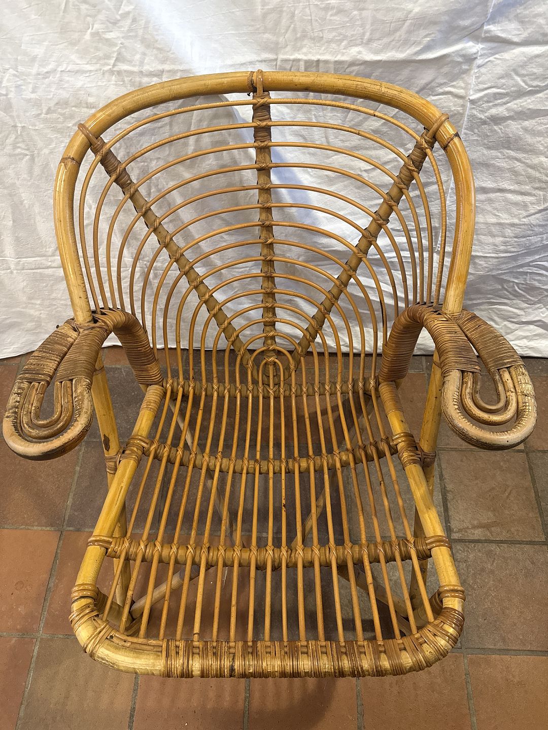 Dansk møbelproducent kurvestol i bambus. Fremstillet ca. 1930'erne. Brugt stand, fremstår med brugsspor. Mål: H. 70 cm. B. 68 cm. D. 75 cm. SH. 37 cm Emne nummer: 81063