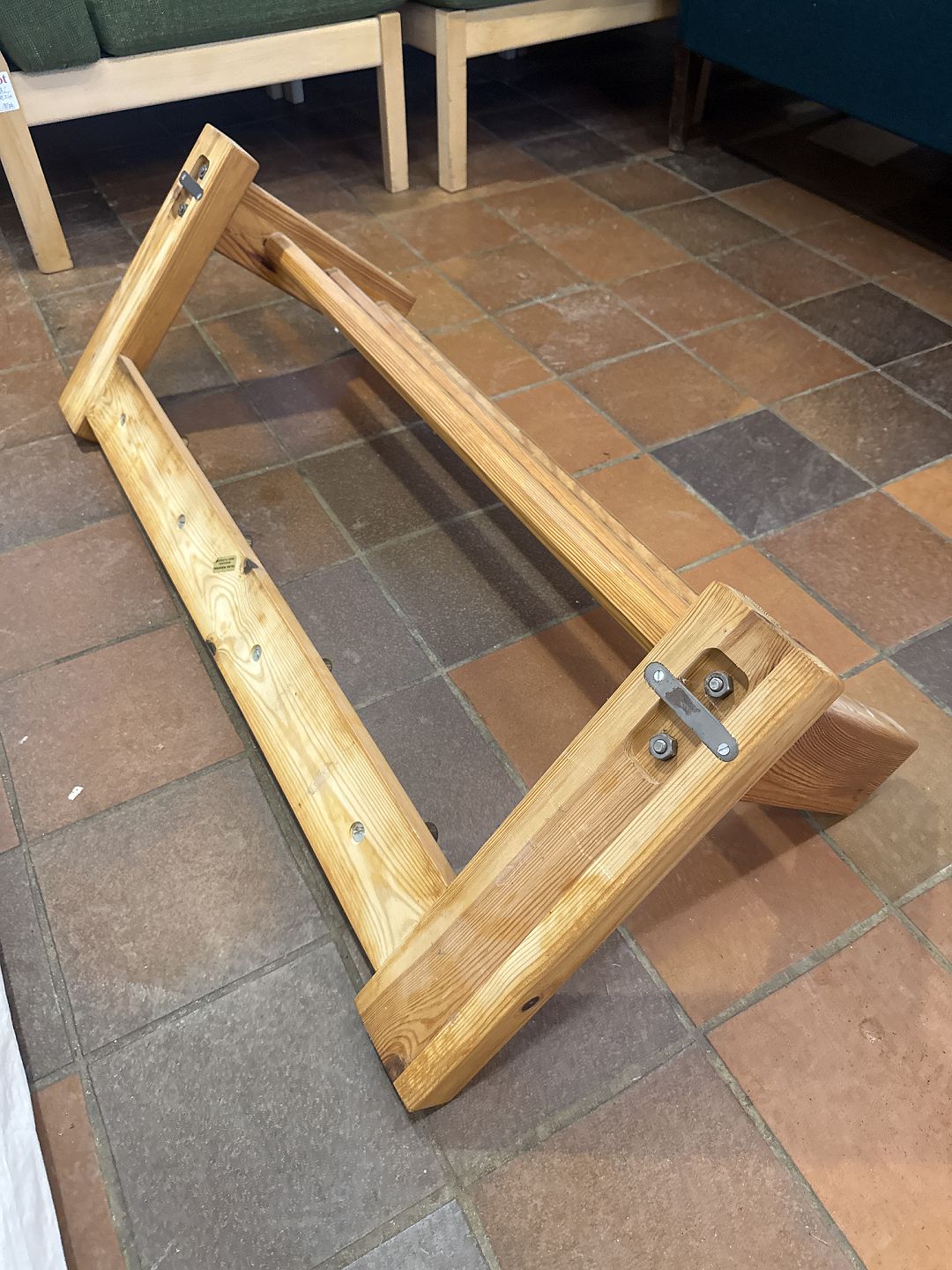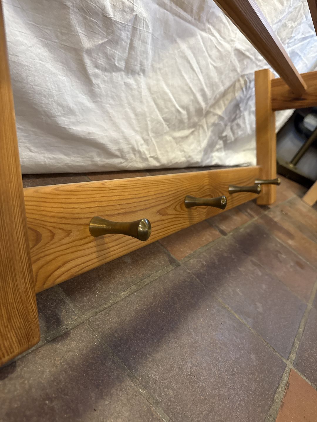 Svensk design væghængt knagerække/hattehylde i massiv fyr og knager i messing. Produceret ca. 1970'erne. Pæn brugt stand. Mål: H. 40 cm. L. 100 cm. D. 35 cm. Emne nummer: 81065