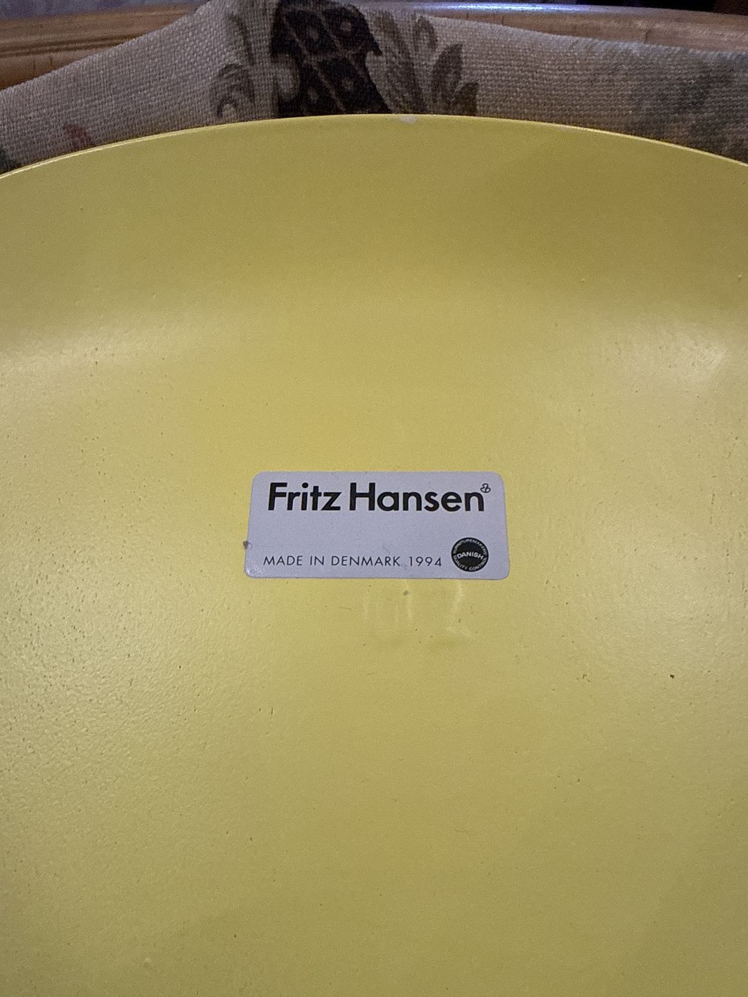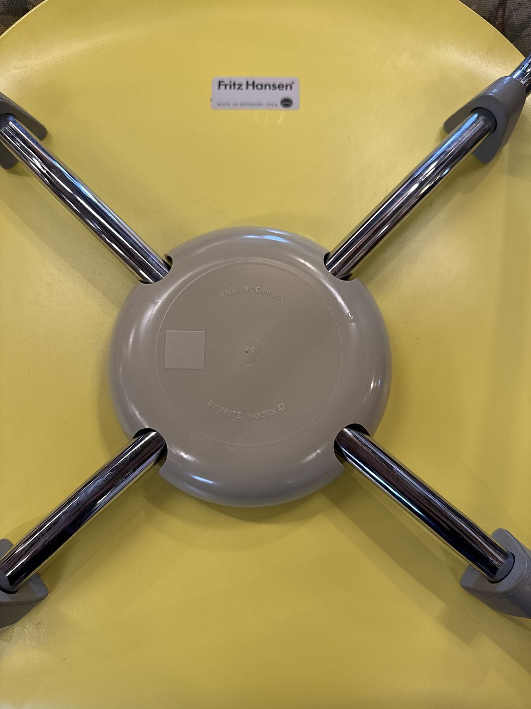 Arne Jacobsen Myrestol gul malet stel i forkromet metal. Fremstillet hos Fritz Hansen 1994. Brugt stand, fremstår m. ridser og mærker. Se foto. Mål: H. 78 cm. B. 50 cm. D. 43 cm. SH. 43 cm. Emne nummer: 81071