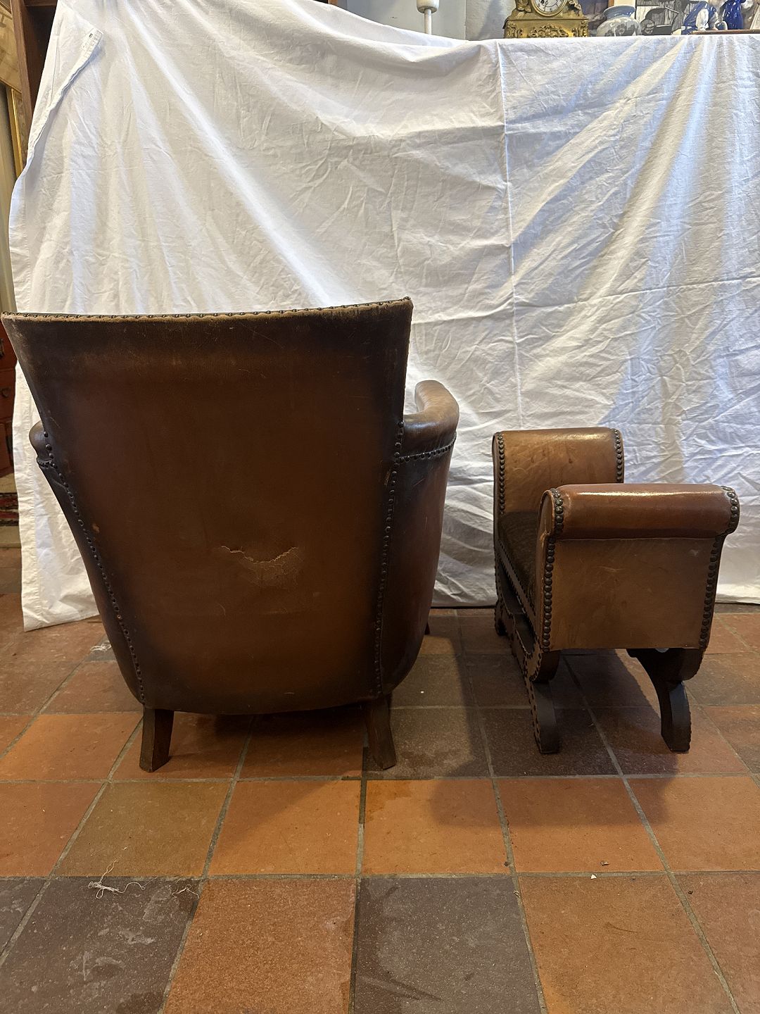 Otto Schulz lænestol i søm beslået patineret skind m. pude i stof. Samt tilhørende skammel i søm beslået skind m. sæde i velour betræk.