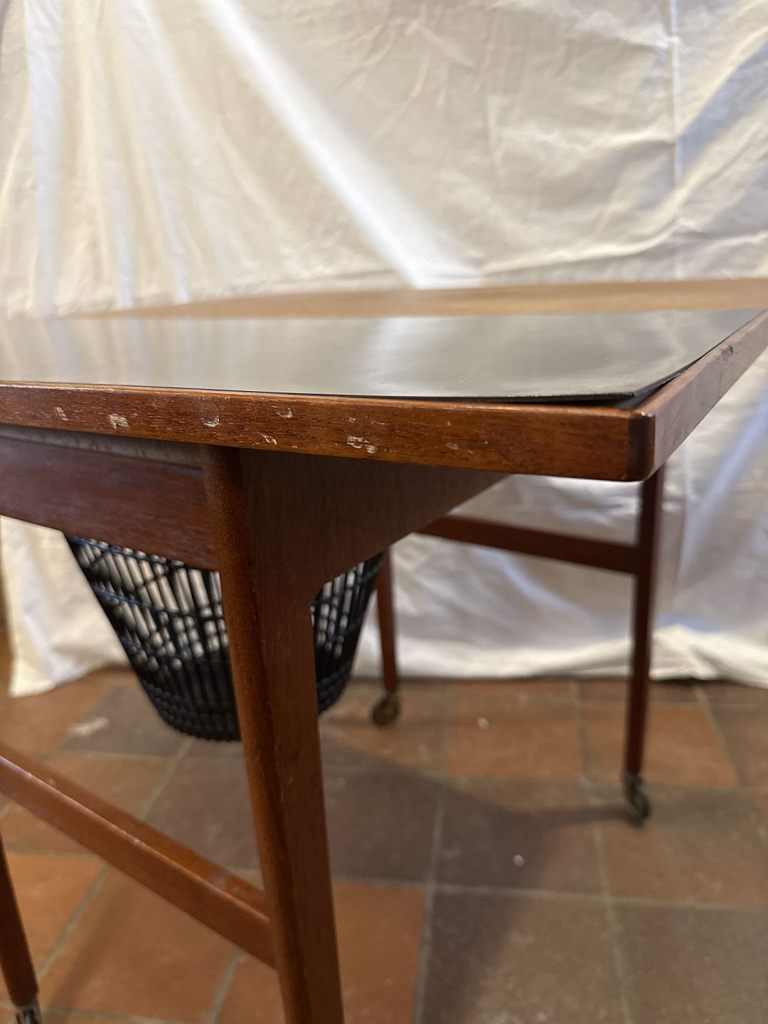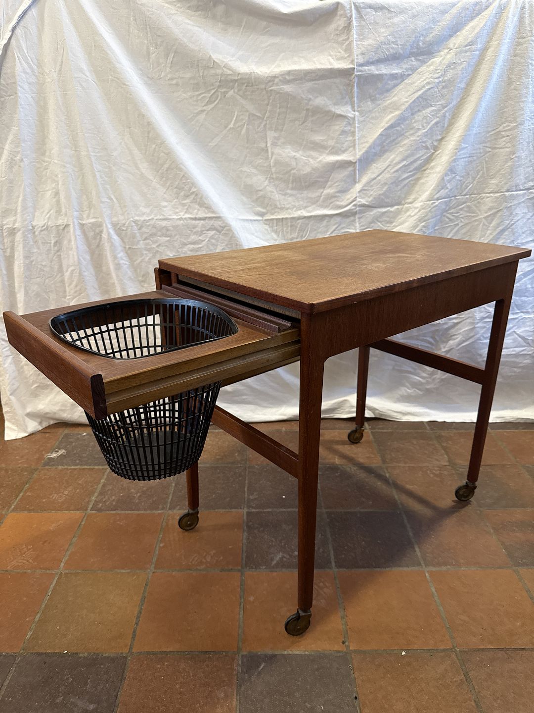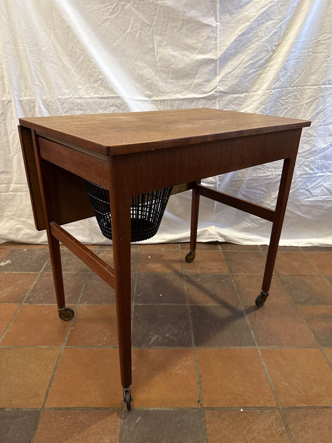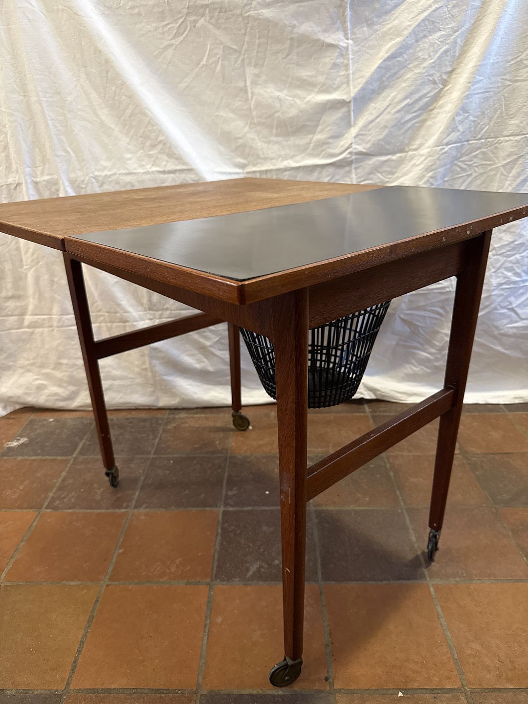 Dansk møbelproducent sybord i fineret teak m. plade i formica. Fremstillet ca. 1970'erne. Brugt stand, fremstår med brugsspor. Se foto. Mål: H. 66 cm. L. 69 cm. D. 45/73 cm. Emne nummer: 81076