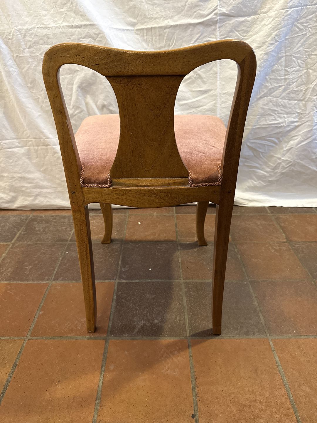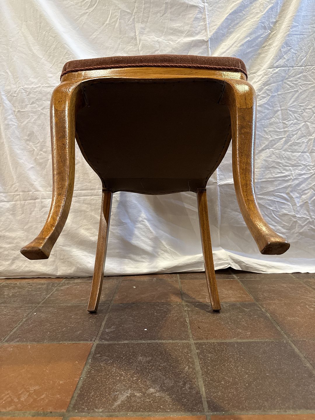 Ukendt formgiver lav rygget stol i lakeret mahogni m. sæde i velourstof. Fremstillet ca. 1920'erne. Pæn brugt stand. Mål: H. 65 cm. B. 41. cm. D. 44 cm. SH. 44 cm. Emne nummer: 81077