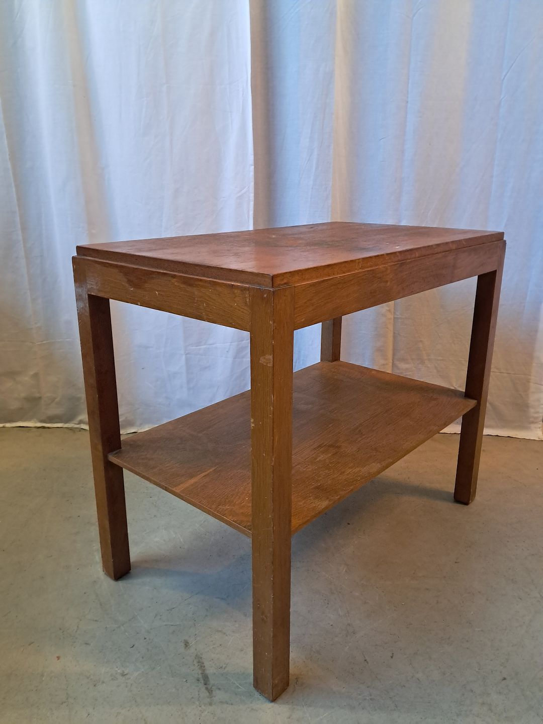 Bord i fineret egetræ, fra 1950erne. Det har en del brugsspor. Højde 65cm Bredde 45cm Dybde 75cm Emne nummer: 77805