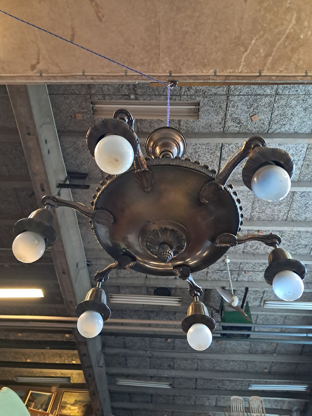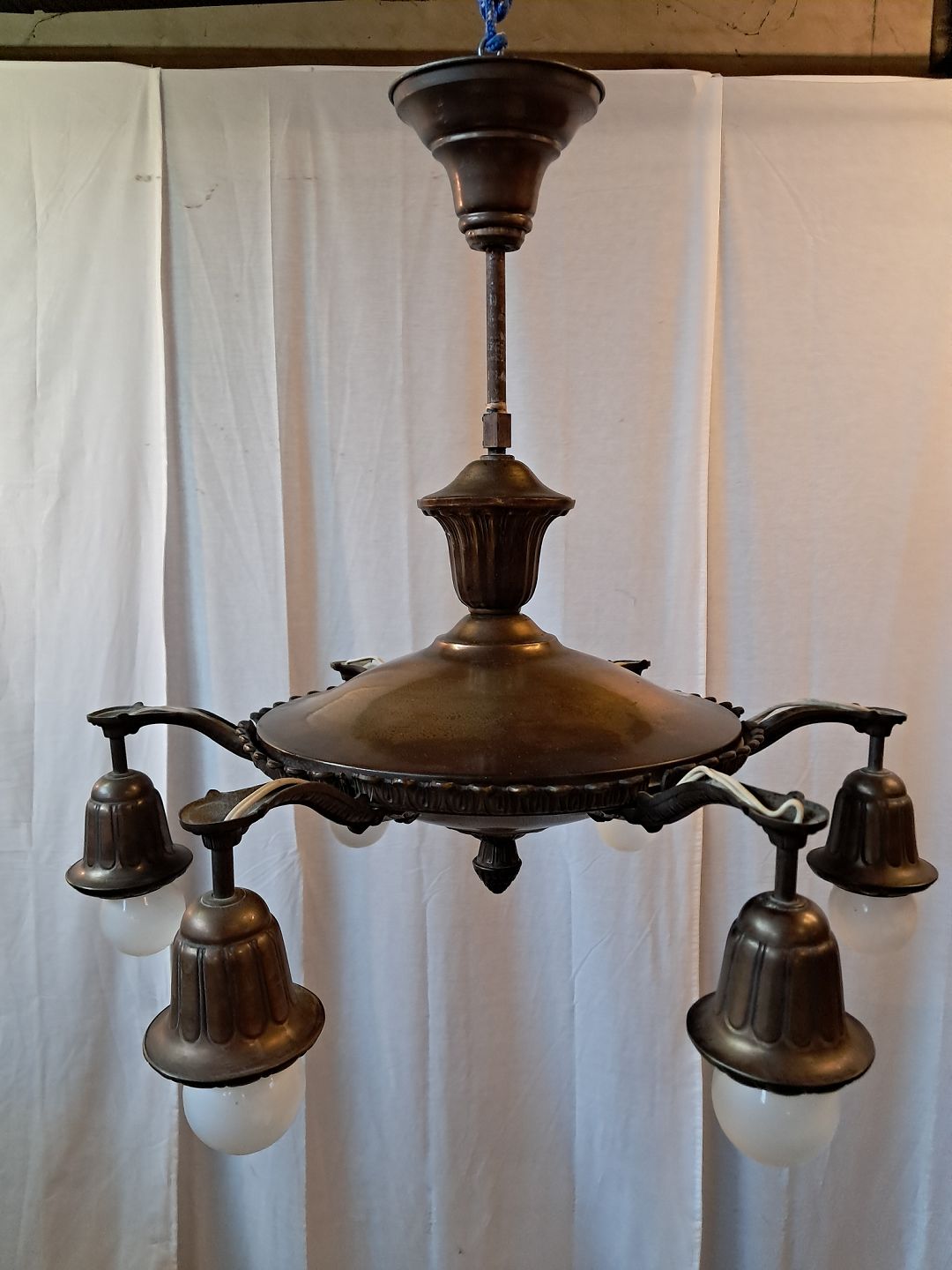 Lysekrone i bruneret messing, fra 1930erne.