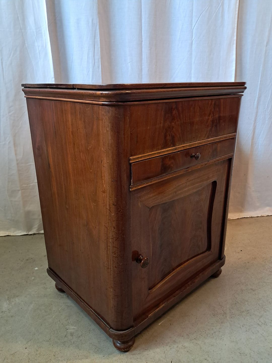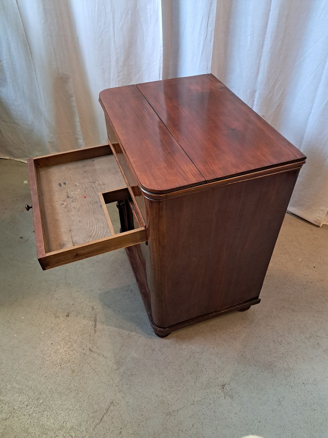 Servante i fineret mahogni, fra 1910erne. Den har brugsspor og en revne i toppladen. Højde 76cm Bredde 60cm Dybde 44cm Emne nummer: 77839