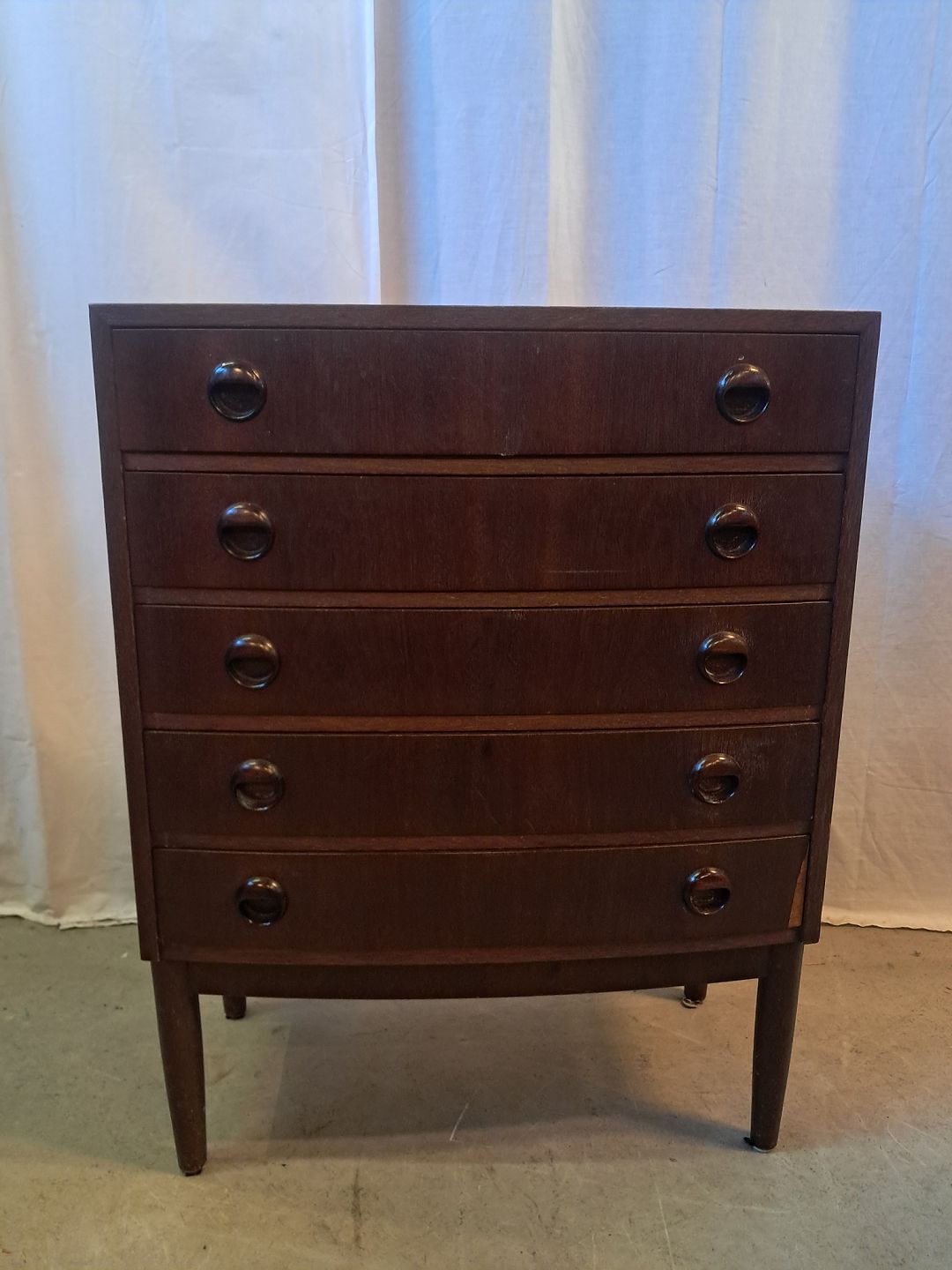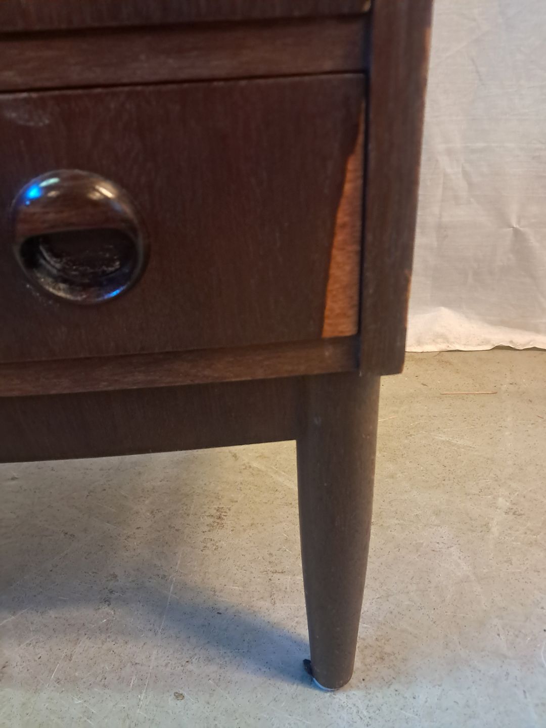 Kommode i bejdset fineret rgrtræ, fra 1960erne. Den har brugsspor og en fineret defekt. Højde 77cm Bredde 60cm Dybde 31cm Emne nummer: 77862
