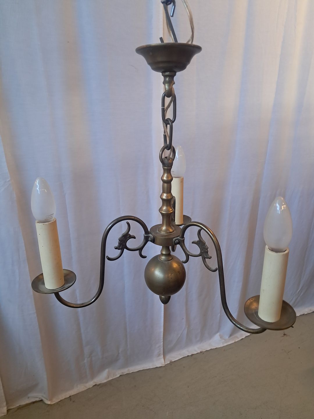 3-armet kirkekrone i bruneret messing, fra 1930erne. Den har brugsspor. Højde med kæde 45cm Diameter 44cm Emne nummer: 77868