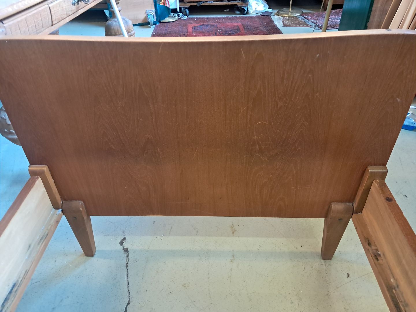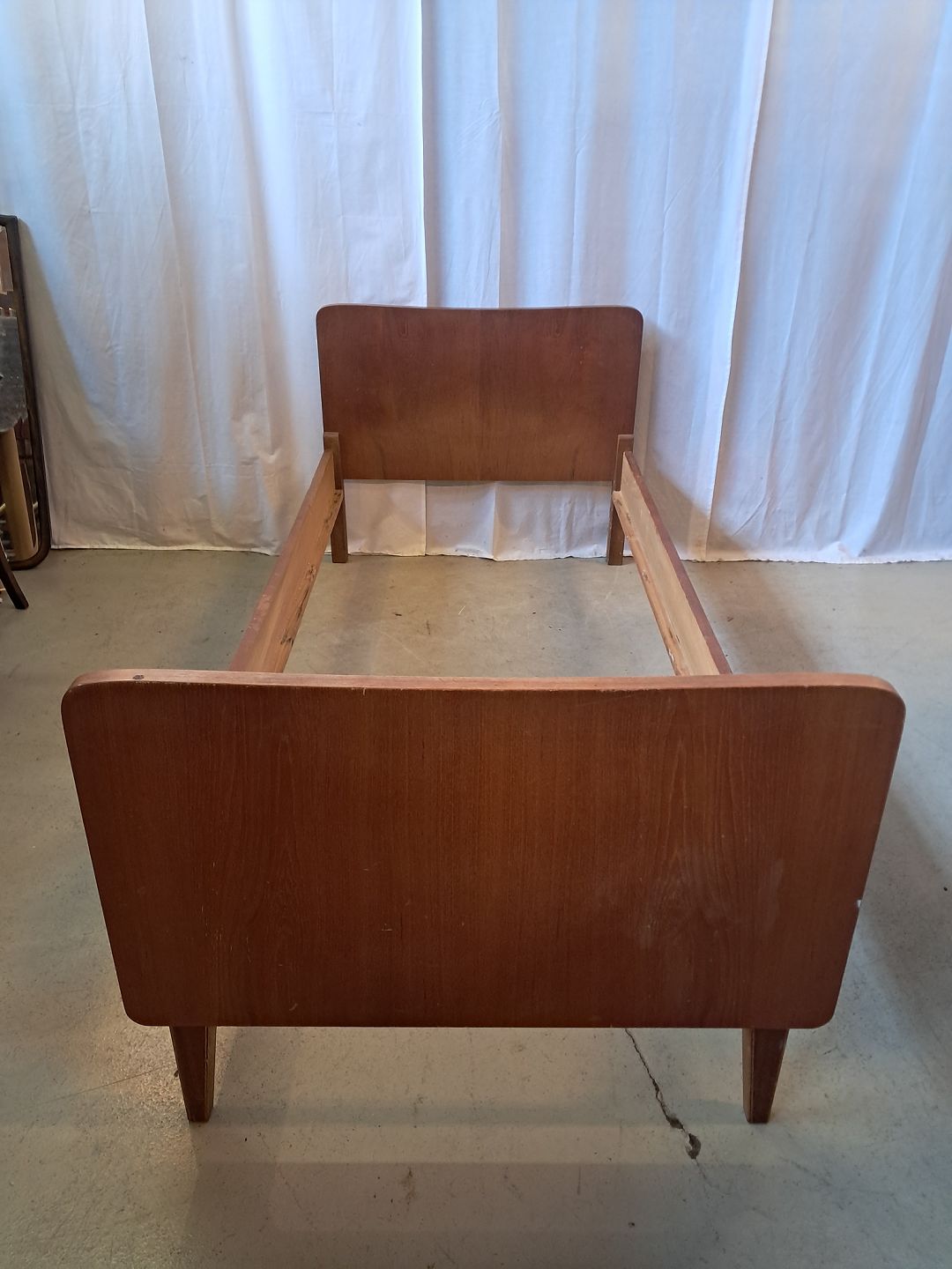 Seng i fineret teaktræ, fra 1960erne. Den har brugsspor og der medfølger ikke madras. Gavlhøjde 76cm Madras mål : 85cm X 190cm Emne nummer: 77873