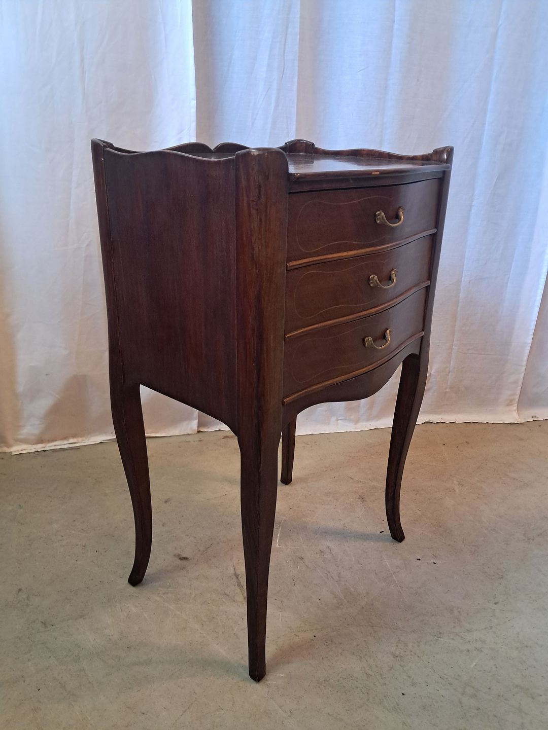 Kommode i fineret mahogni, fra 1950erne. Den har brugsspor. Højde 73cm Bredde 57cm Dybde 43cm Emne nummer: 77874