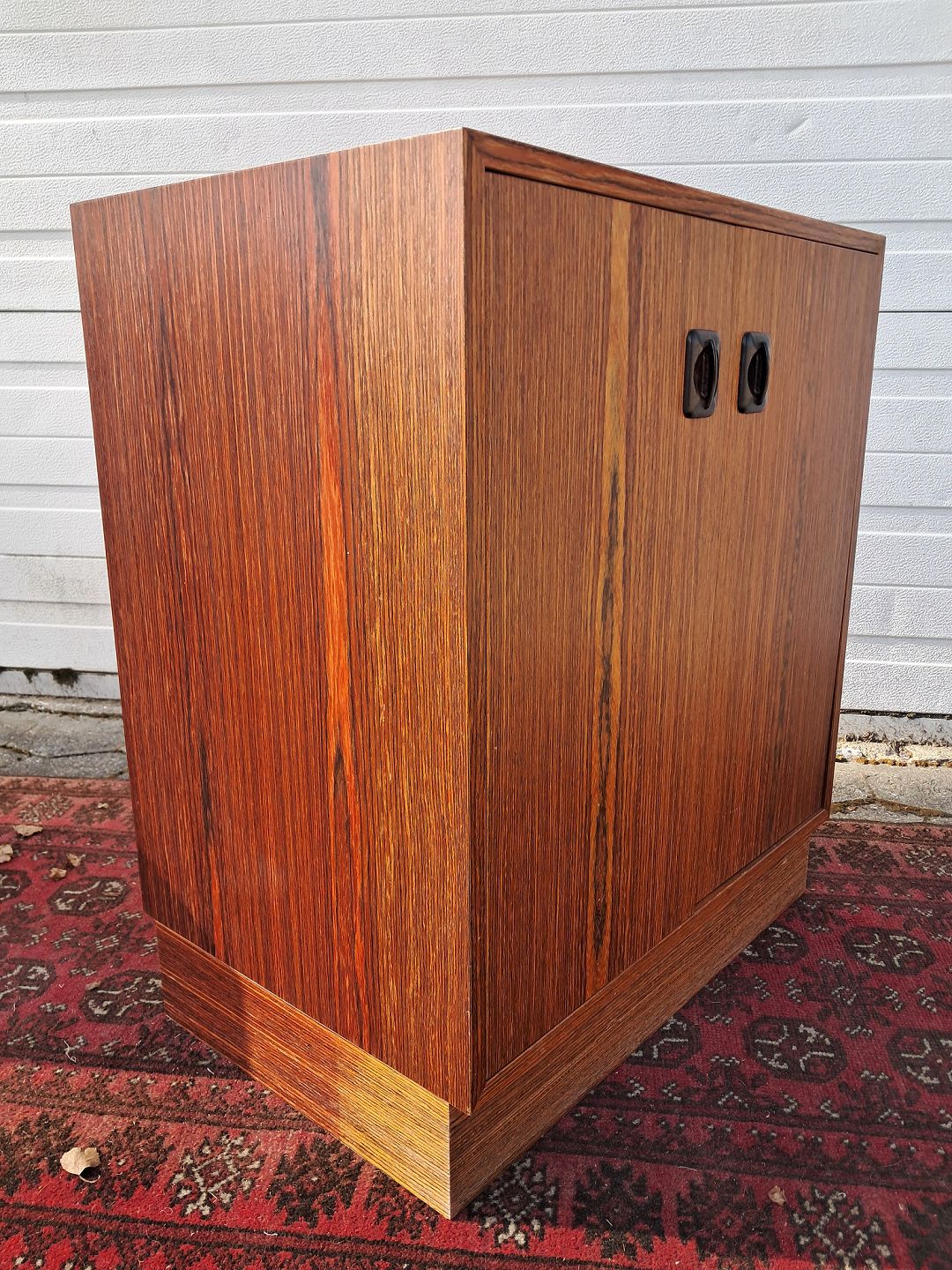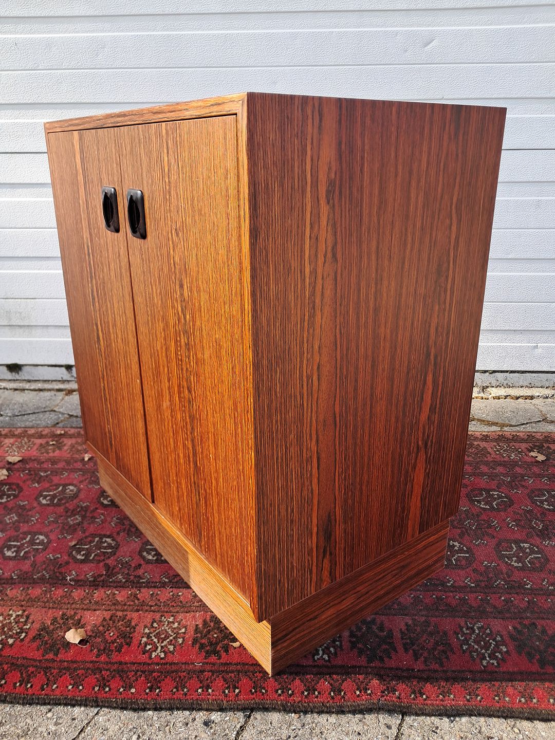 Skab i fineret palisander, fra 1970erne. Det har brugsspor. Højde 71cm Bredde 60cm Dybde 40cm Emne nummer: 77896