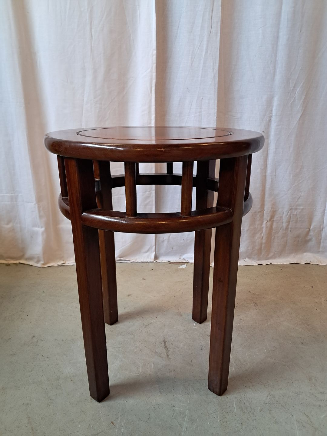 Asiatisk skammel i massivt træ, fra 1990erne. Den har brugsspor. Højde 56cm Diameter 45cm Emne nummer: 77913