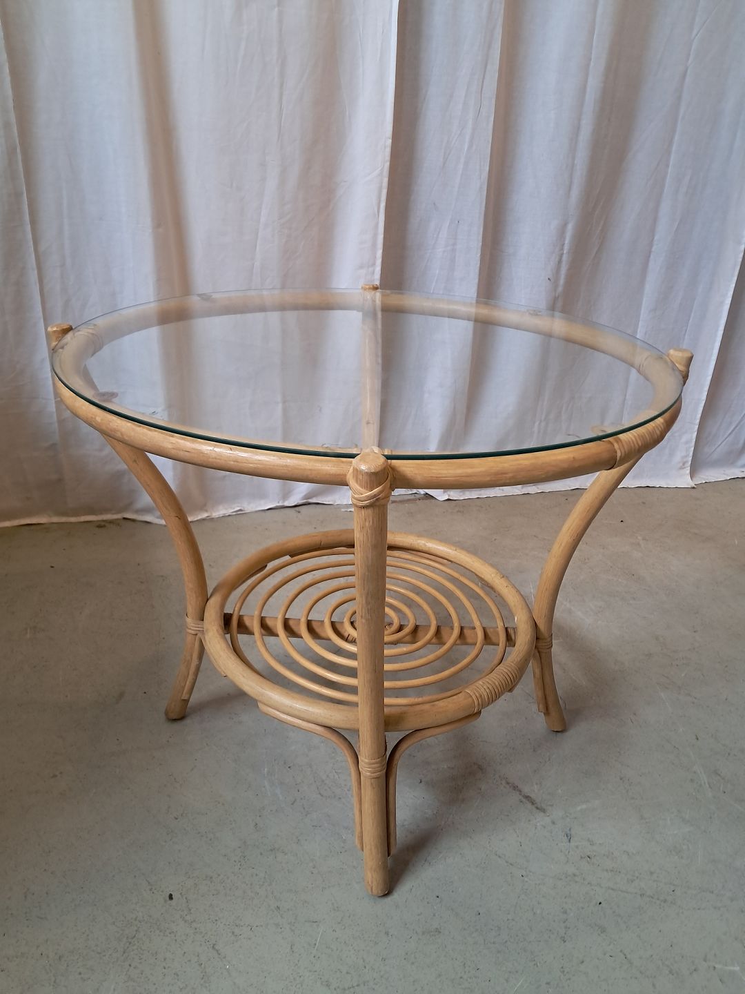 Bord i bambus med glasplade, fra 1990erne. Det har brugsspor. Højde 58cmcm Diameter 76cm Emne nummer: 77924