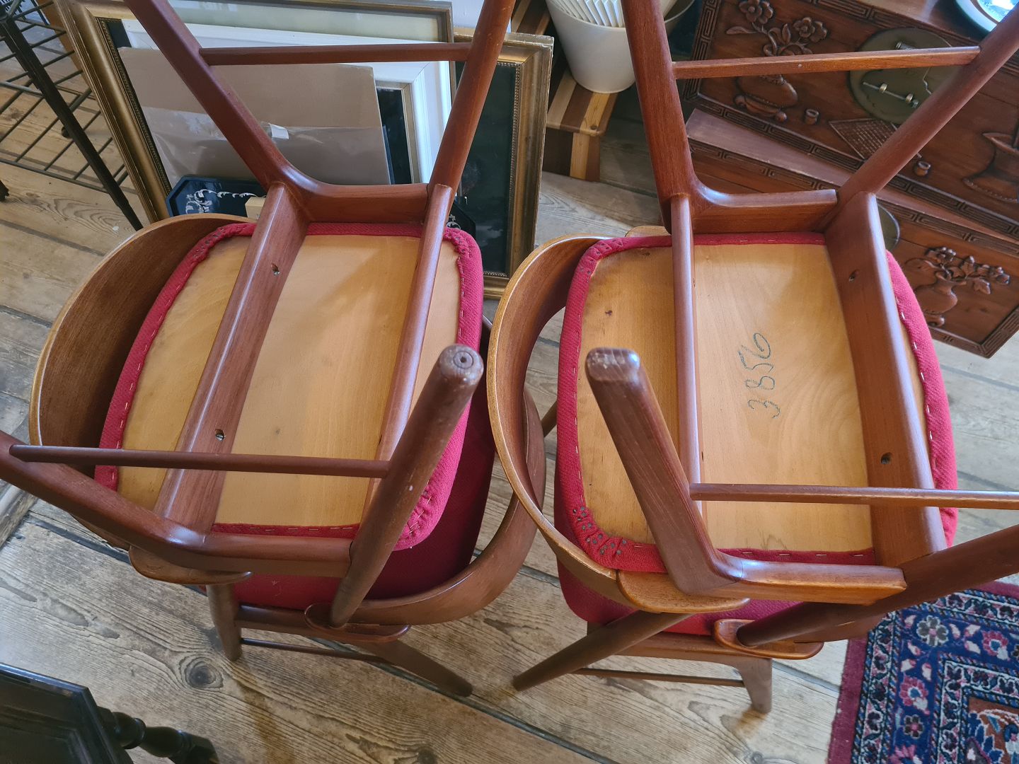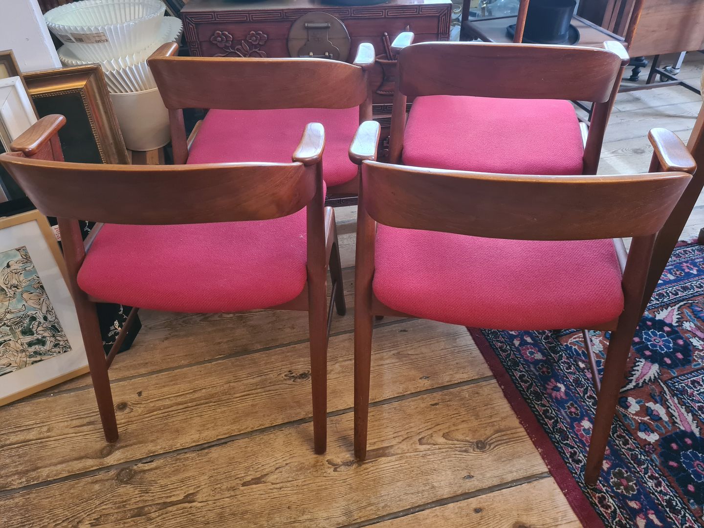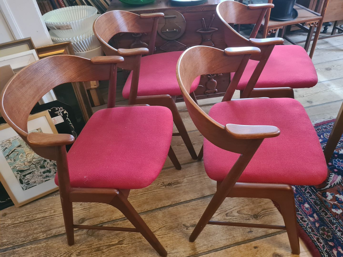 4 spisebordsstole fra 1960'erne designet af Kai Kristiansen. Her i teak med stofbetrukket sæde. Fremstår pæne og velholdte uden nævneværdige brugsspor. Højde 76 cm. Bredde 53 cm. Dybde 51 cm. Sædehøjde 46 cm. Emne nummer: 81039