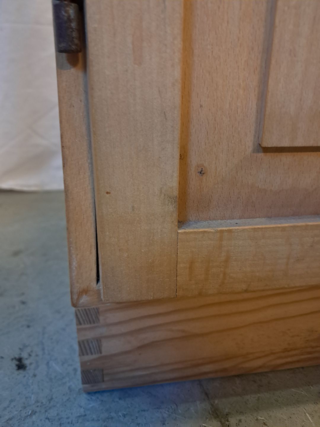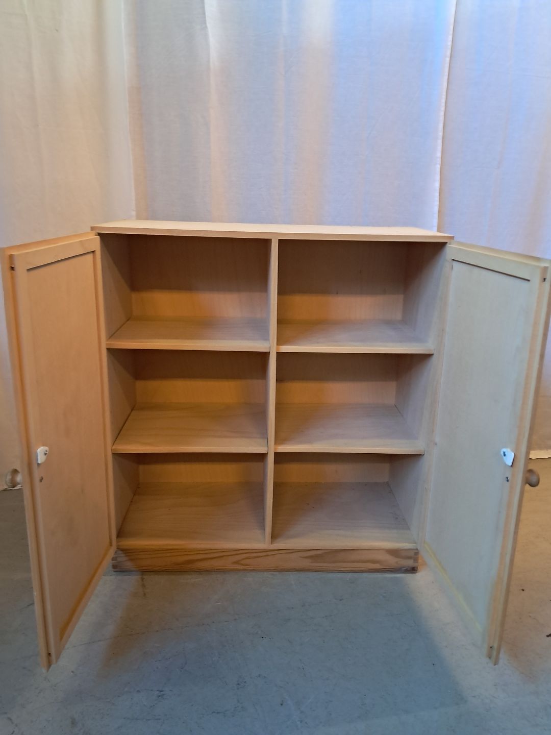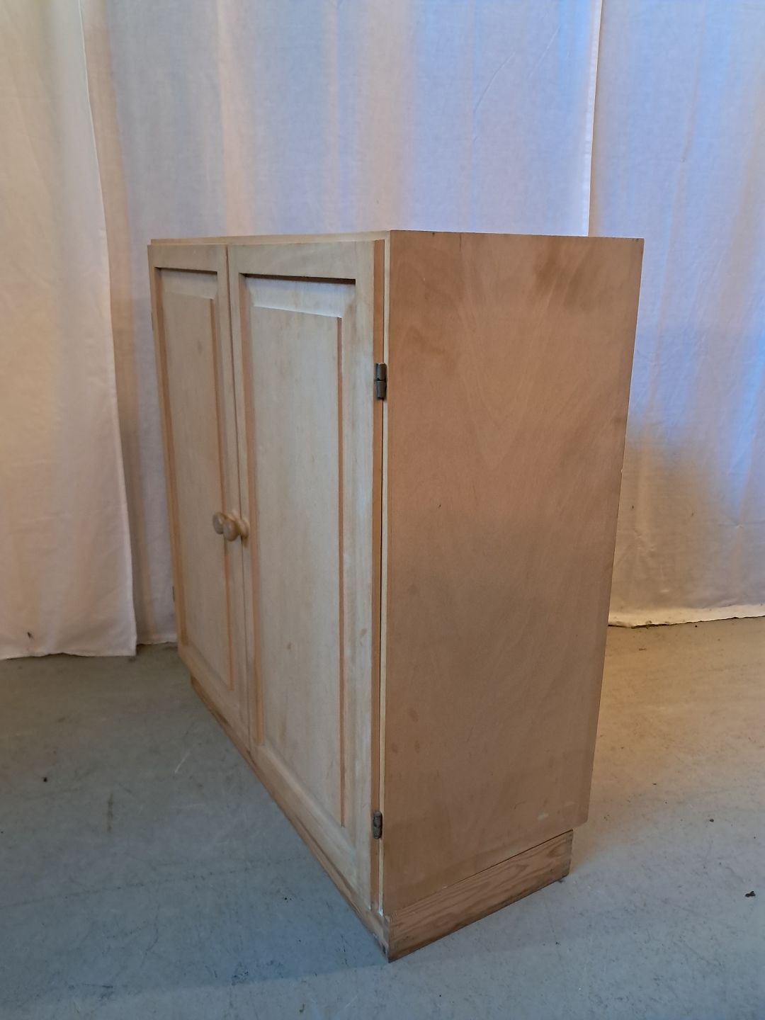 Skab i bøge krydsfiner, fra 2000erne. Det har brugsspor og gaber lidt i venstre hjørne.(se foto) Højde 70cm Bredde 70cm Dybde 30cm Sokkelhøjde 7cm Emne nummer: 77985