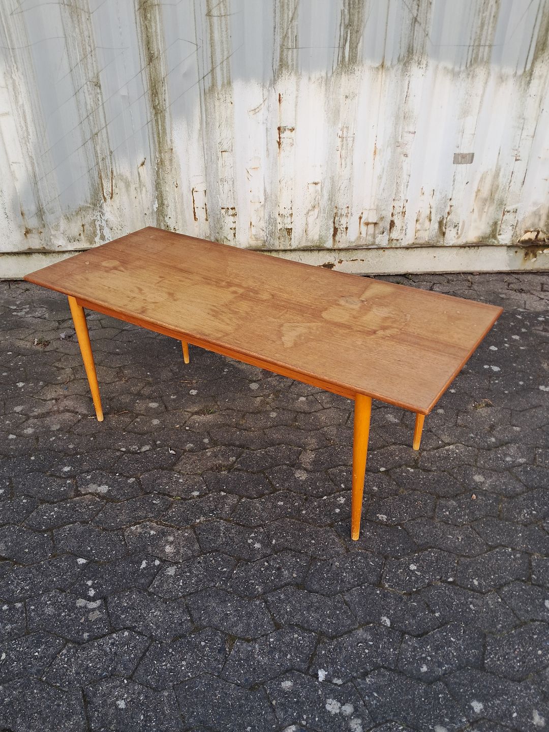 Sofabord i fineret teaktræ med ben i massivt bøgetræ, fra 1960erne. Bordpladen har brugsspor. Højde 52cm Bredde 55cm Længde 130cm Emne nummer: 77990