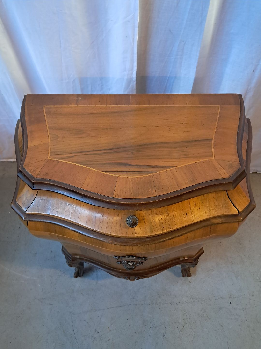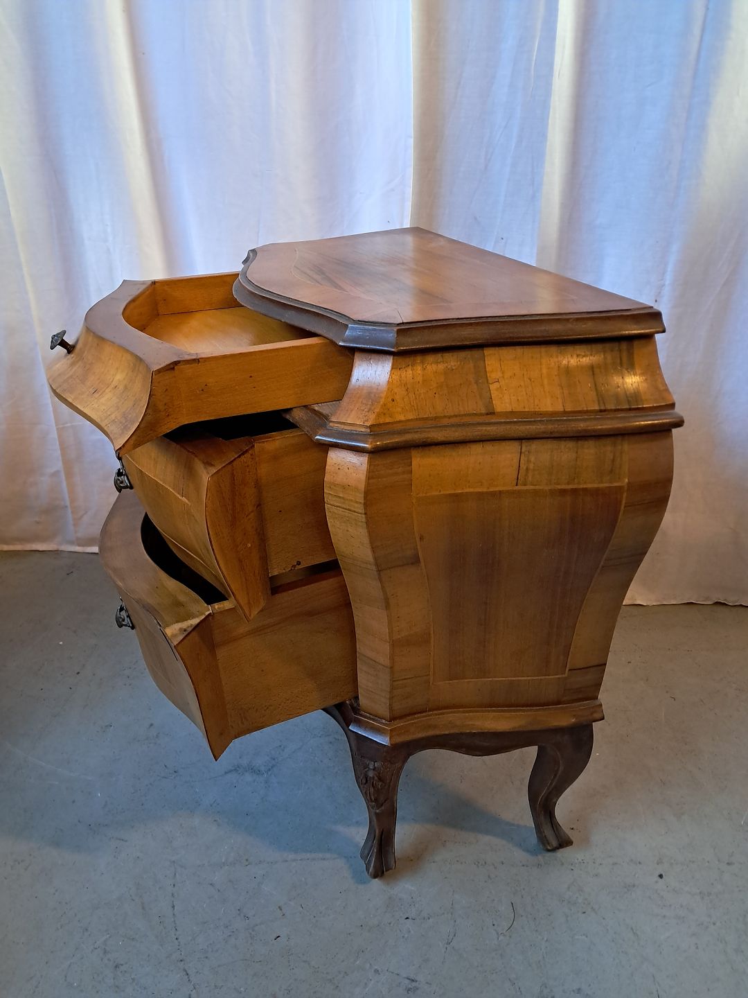 Rokoko kommode i fineret nødetræ, fra 1980erne. Den har brugsspor. Højde 68cm Bredde 64cm Dybde 36cm Emne nummer: 78004