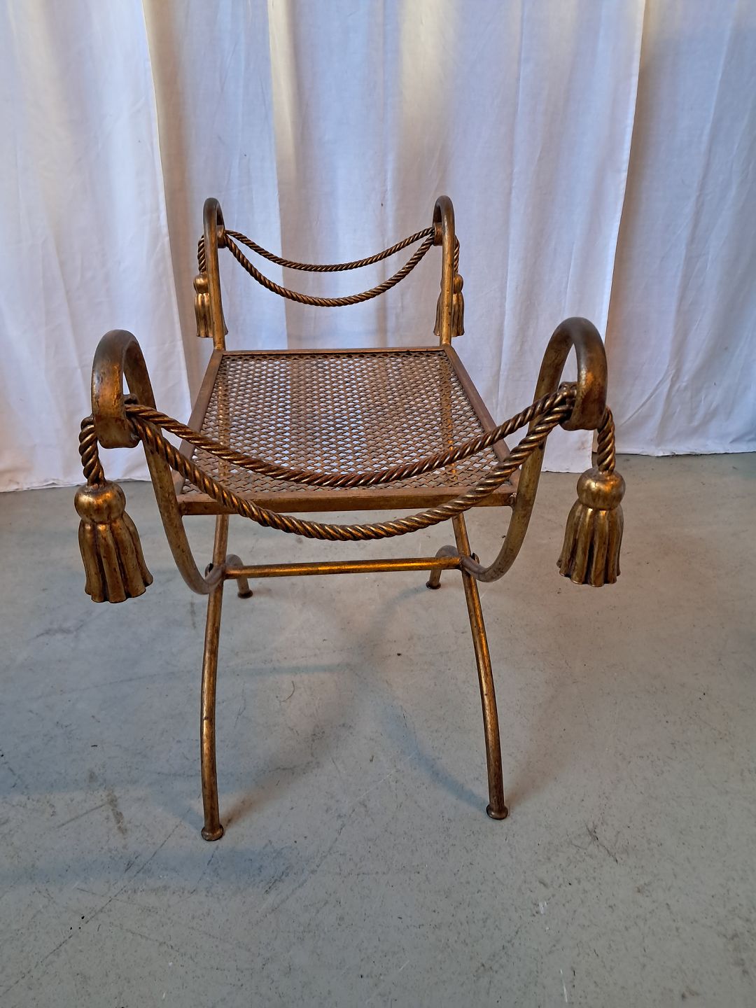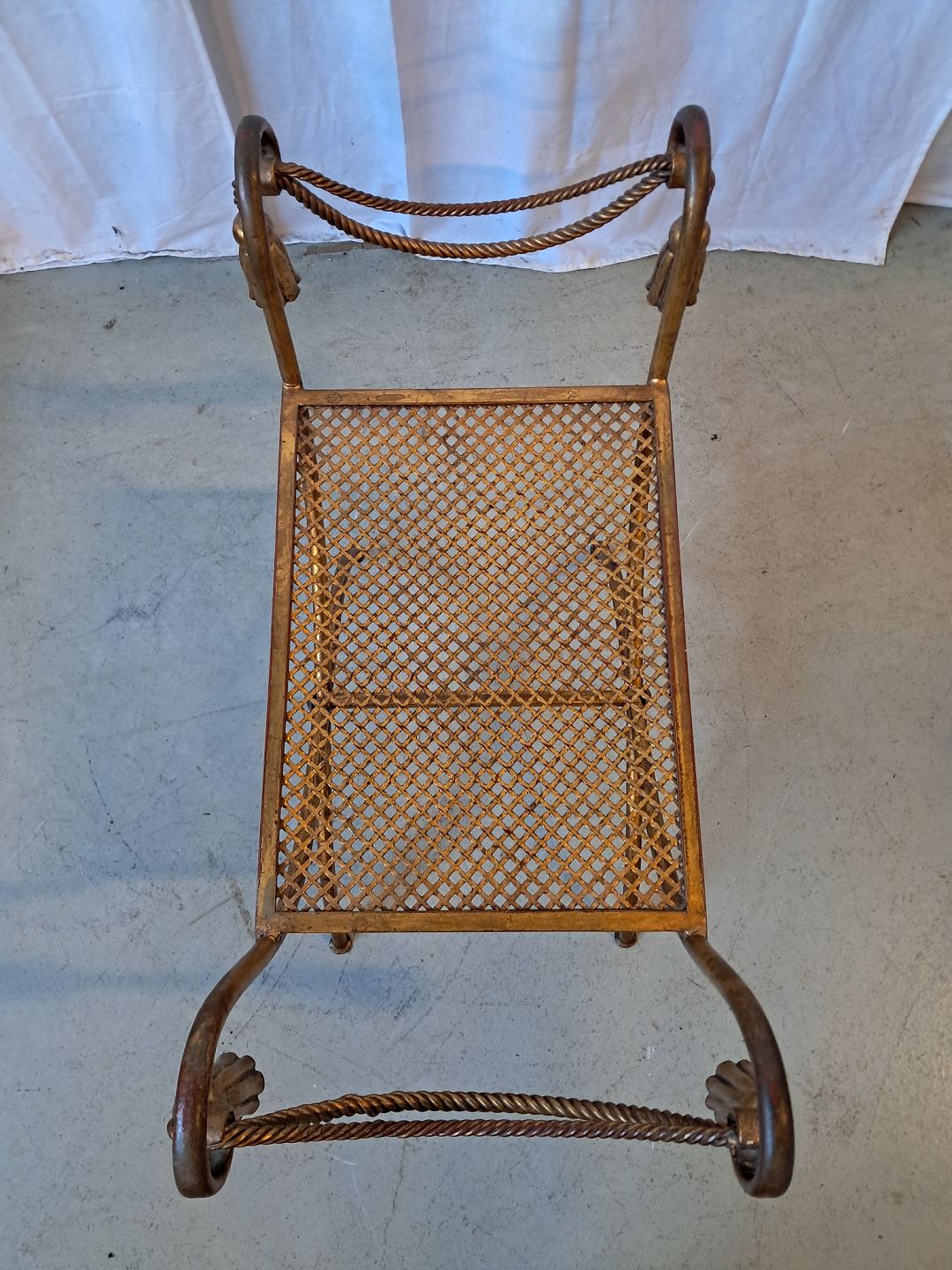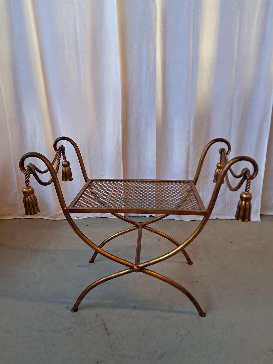Malet metal skammel, fra 1990erne. Den har brugsspor. Højde 60cm Sædehøjde 42cm Bredde 75cm Dybde 35cm Emne nummer: 78005