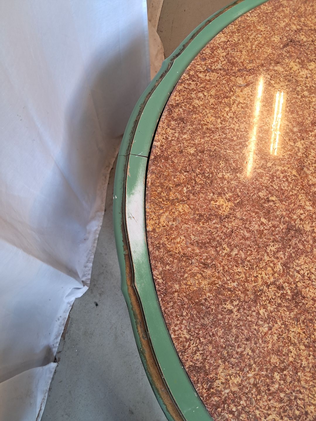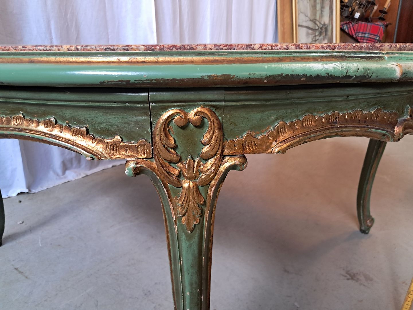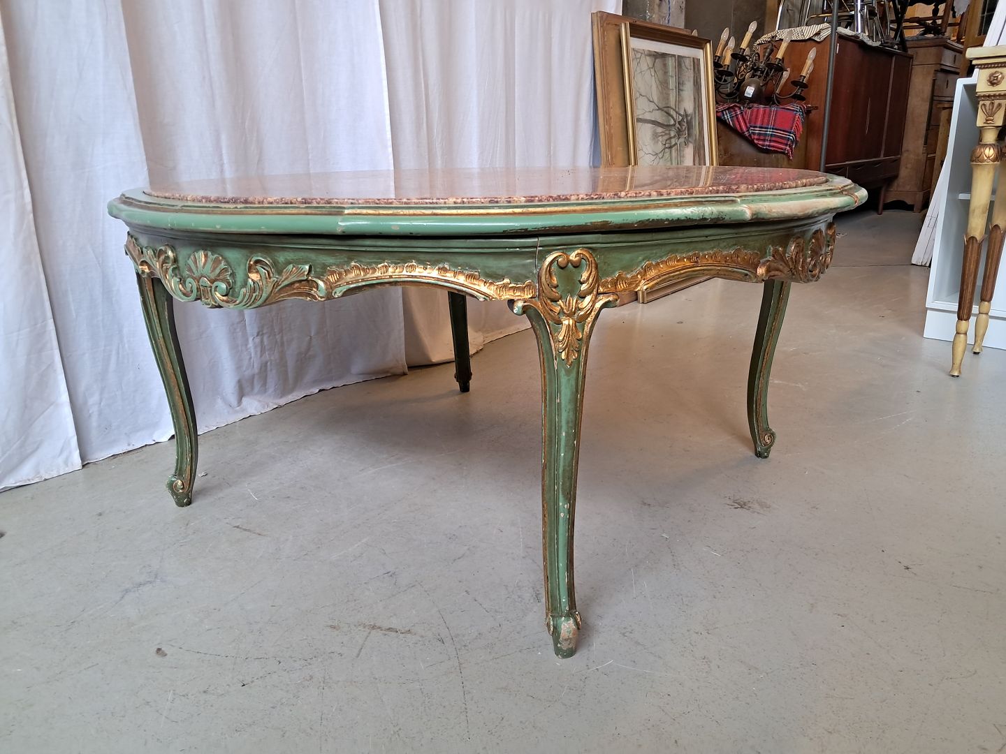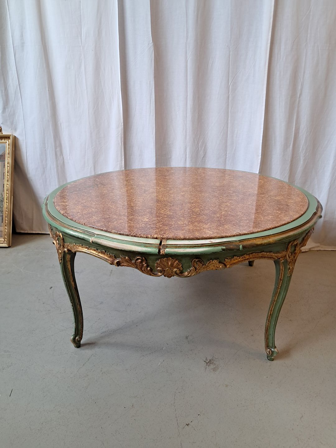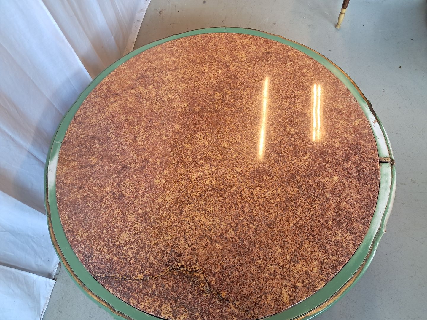 Malet sofabord med marmorplade, fra 150erne. Det har brugsspor og en reparation. Højde 56cm Diameter 119cm Emne nummer: 78042