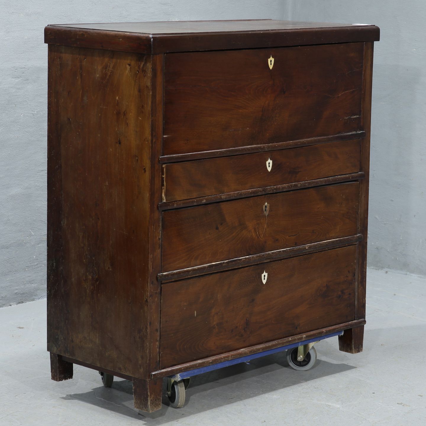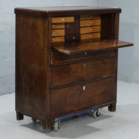 Kommode i fineret mahogni m. skriveklap, fra 1880-1890erne. Den har brugsspor og defekte låse. H 112cm B 98cm D 46cm Emne nummer: 33212
