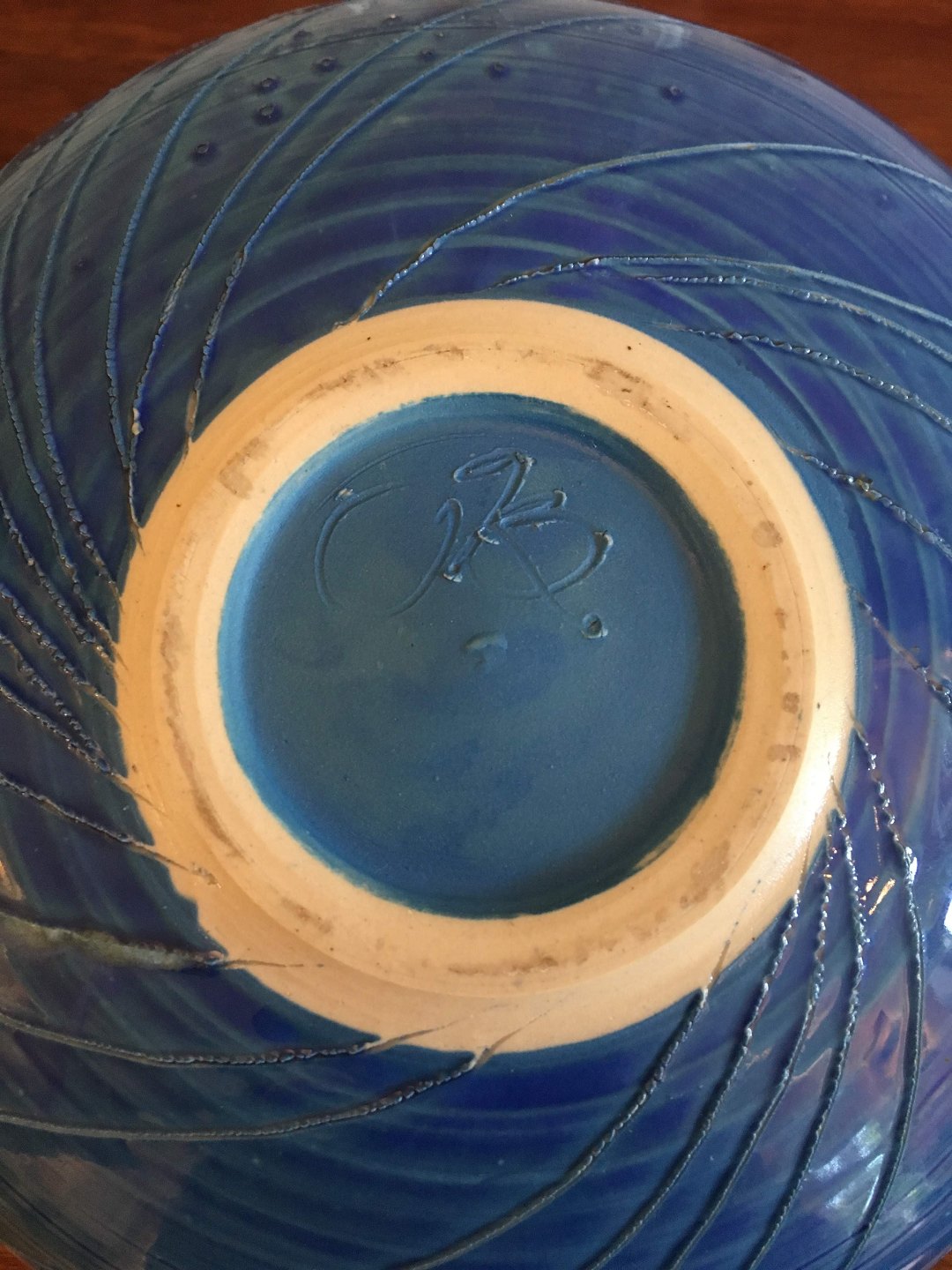 Skål i blåglaseret stentøj med indridsninger i skærven, unika designet af Jane Bailey, højde 12,9 cm, diameter 24 cm Emne nummer: 50009