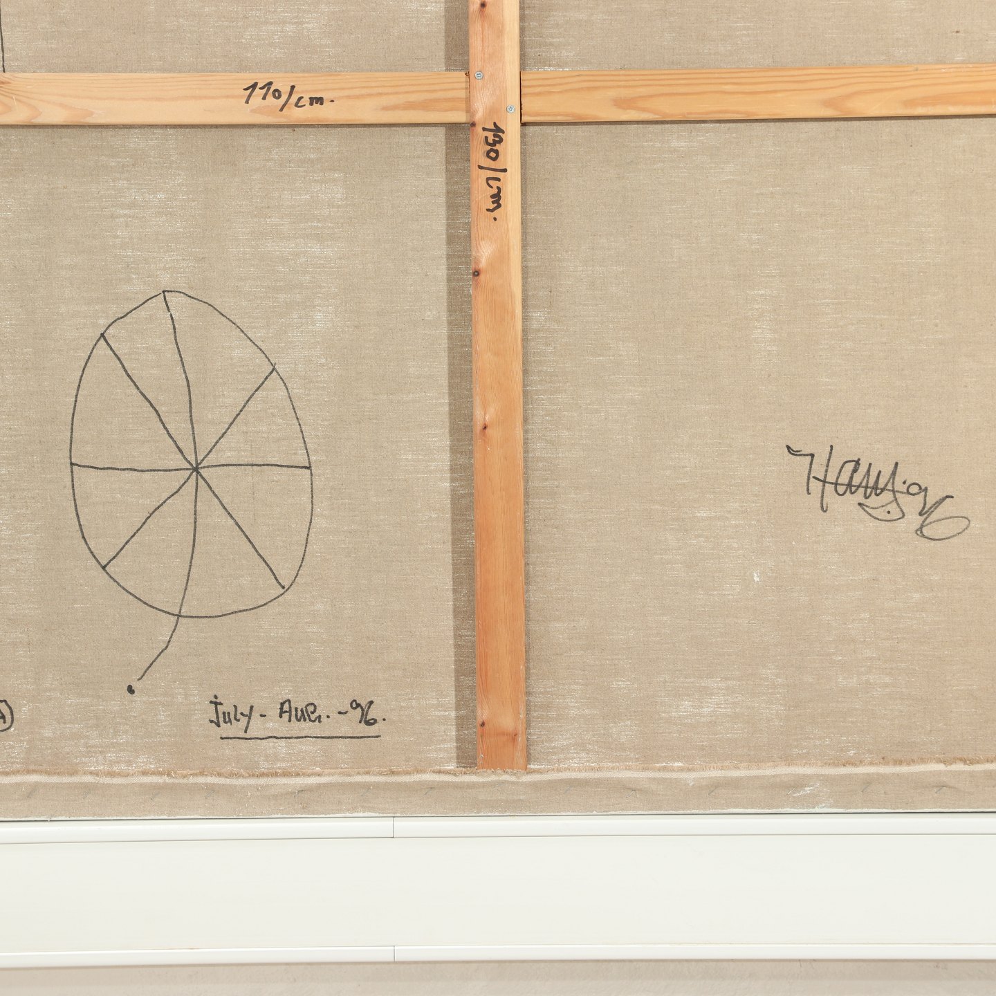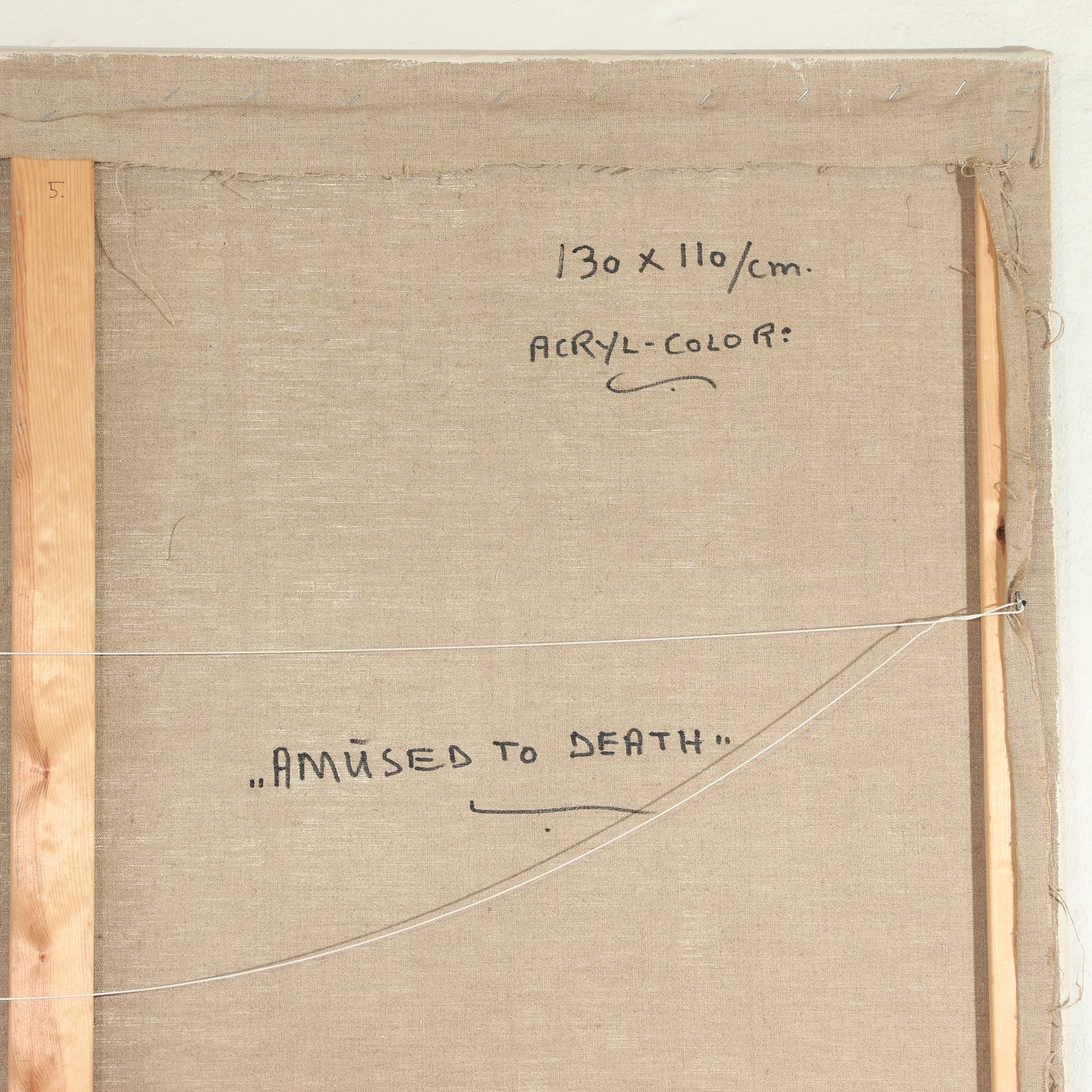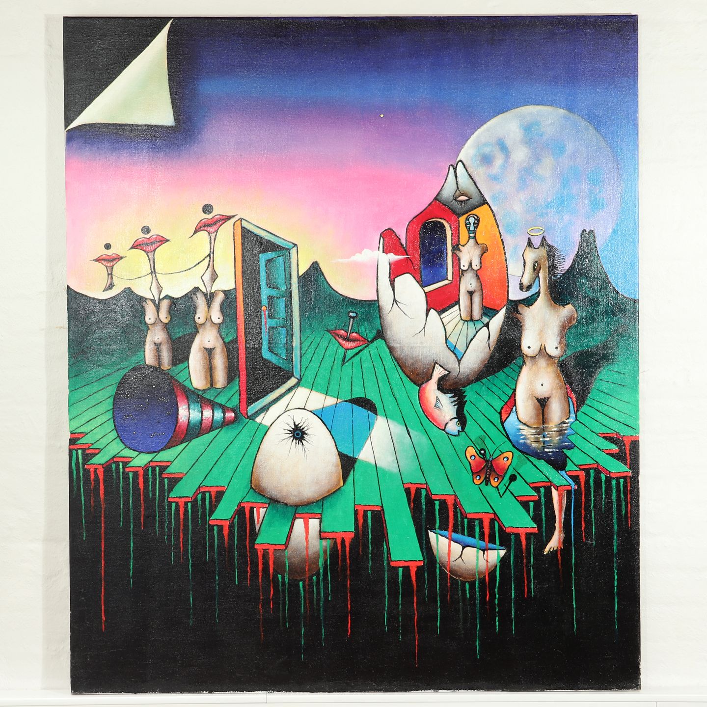 Surrealistisk maleri af Hans Nielsen f. 1923 d. 1998, 'Amused to Death' olie på lærred uden ramme, Højde 130 cm, bredde 110 cm, signeret på bagsiden Emne nummer: 50108
