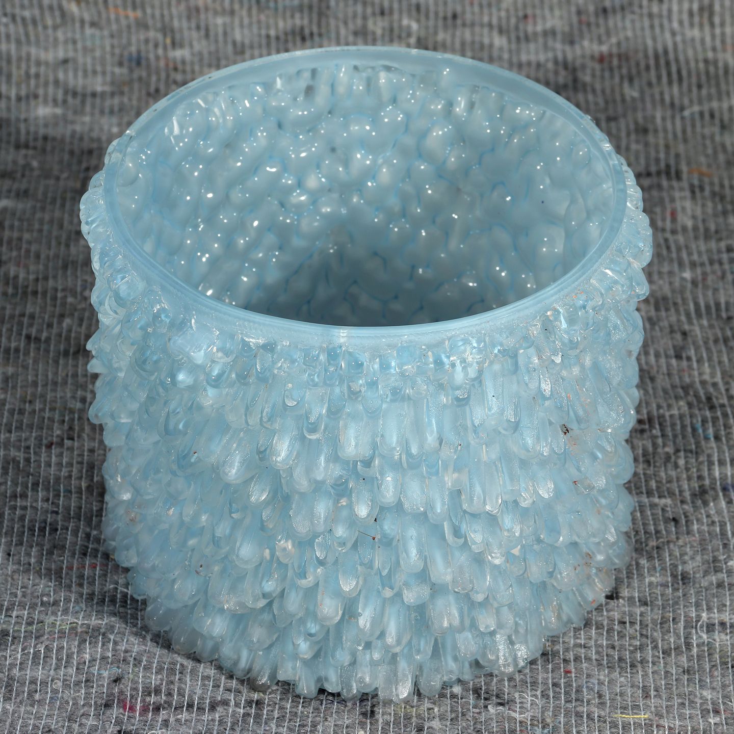Unika urtepotteskjuler i lyseblåt glas, OBS afslag på en enkelt tap, designet af Lene Bødker, højde 15 cm, diameter 17 cm Emne nummer: 50132