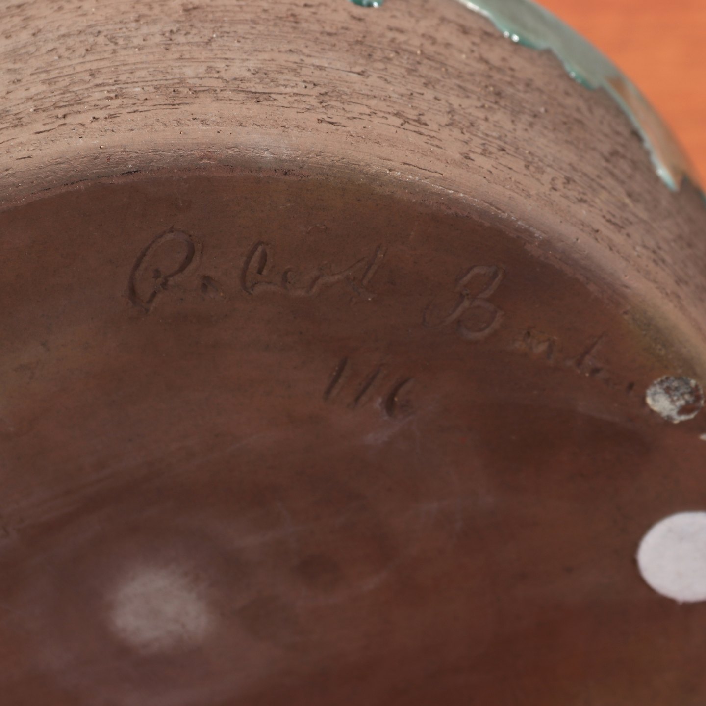 Vase i stentøj med løbeglasur utydeligt signeret i bunden. Højde 12,5 cm, diameter 21 cm. Emne nummer: 50372