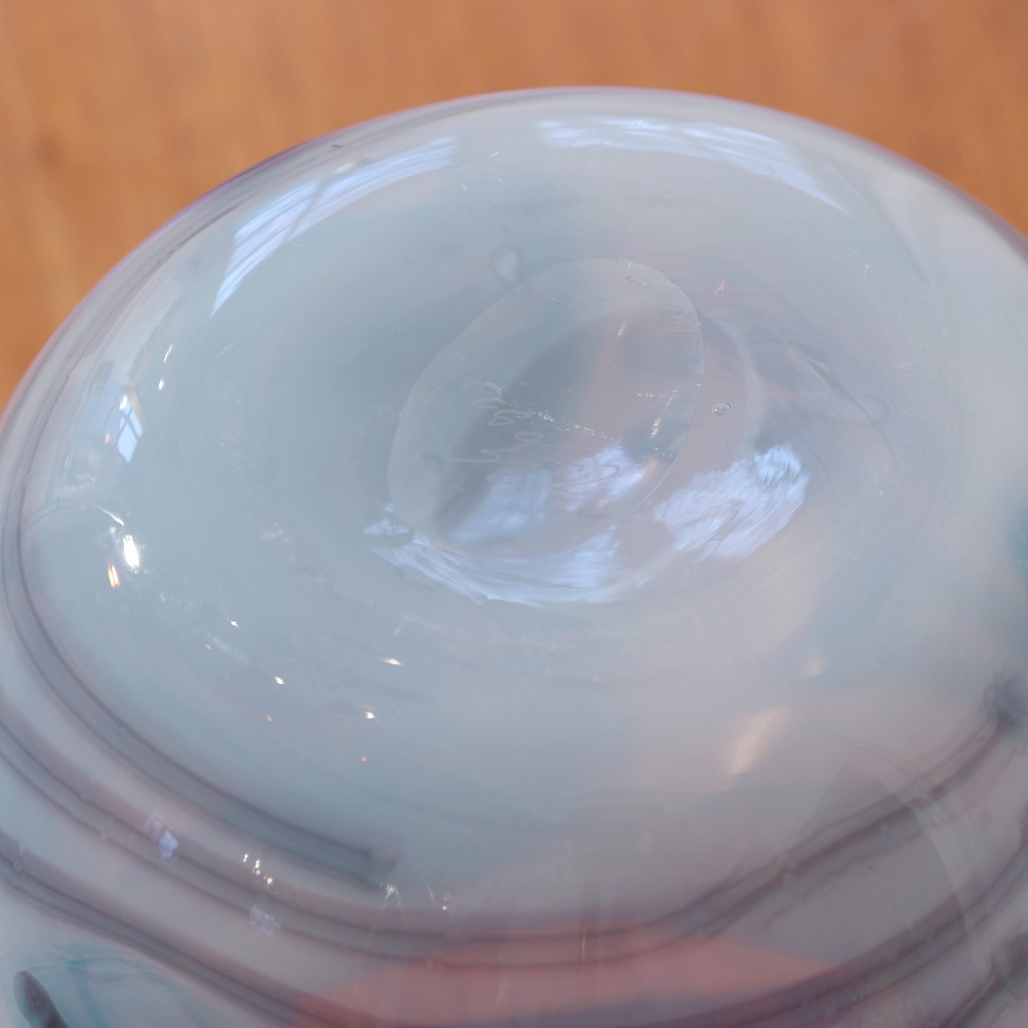 Vase i kunstglas med utydelig siganatur i bunden lavet i 1992. Højde 21 cm, diameter 22 cm Emne nummer: 50396