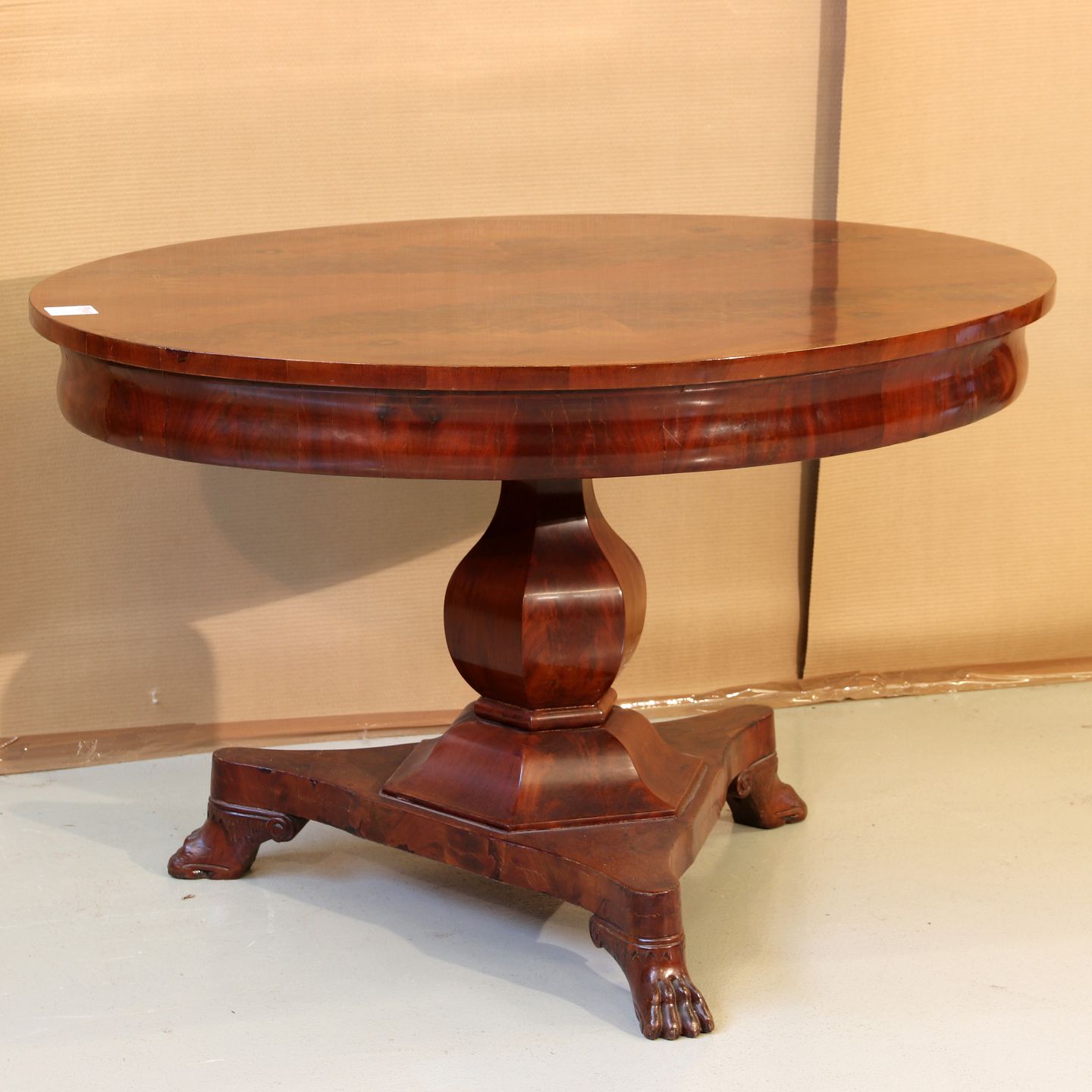 Ovalt salonbord i fineret mahogni på søjlefod,