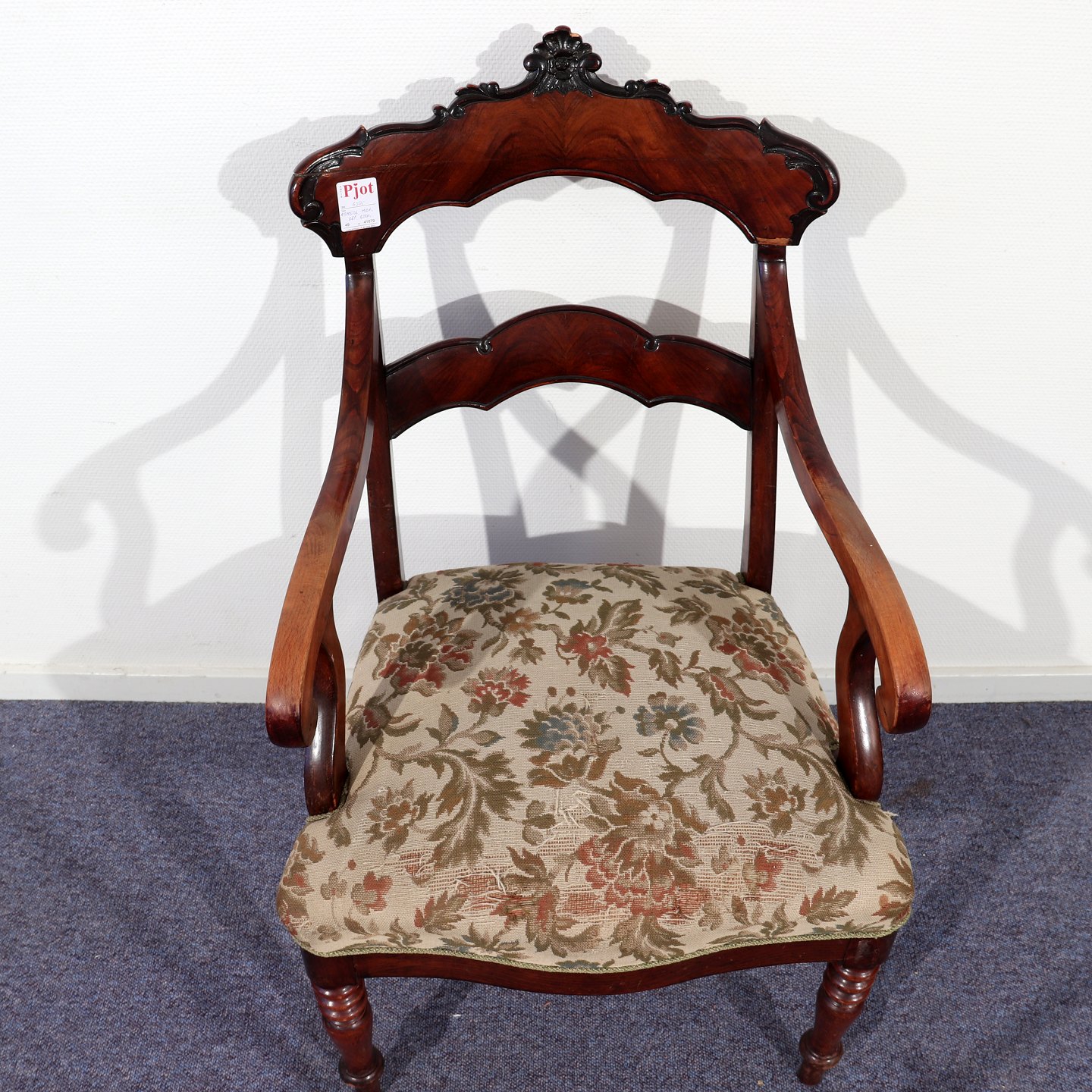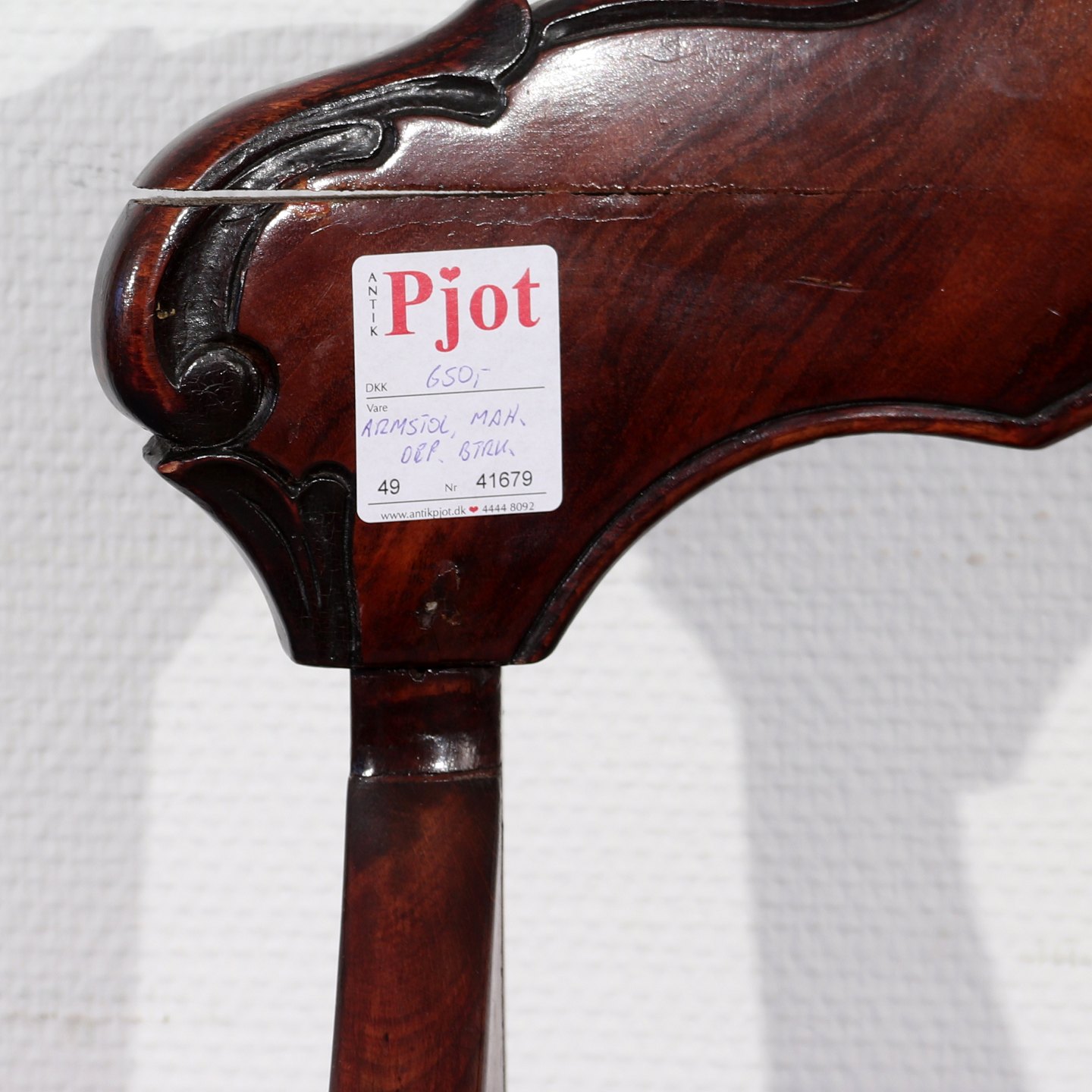 Armstol i fineret mahogni, OBS div. defekter, 101 cm høj, sædehøjde 46 cm, 1890-1900 Emne nummer: 41679