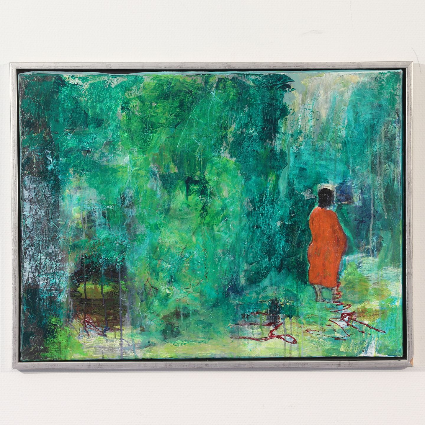 Kvinde i skov, olie på lærred i forsølvet ramme, (HxB 64x84 cm), usigneret