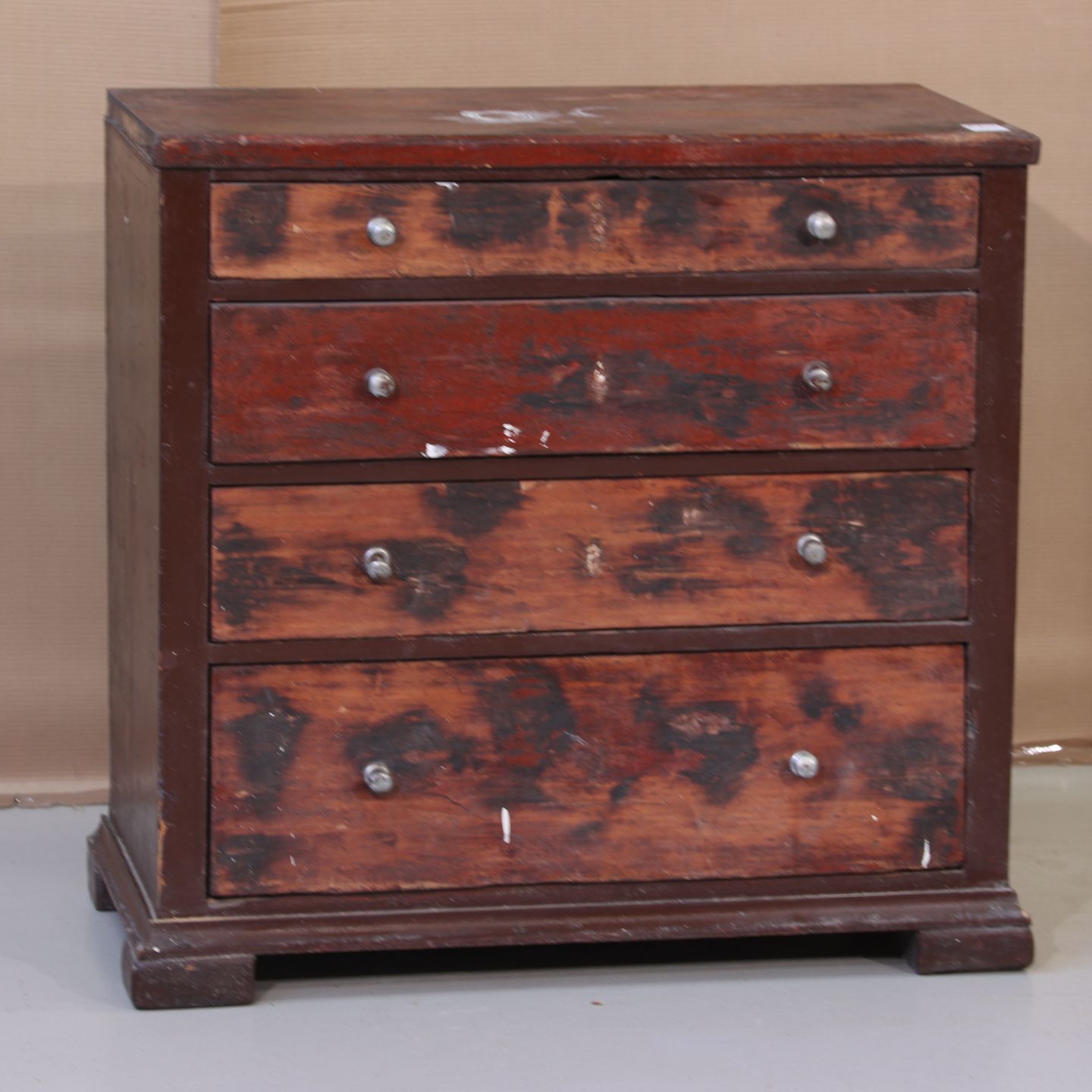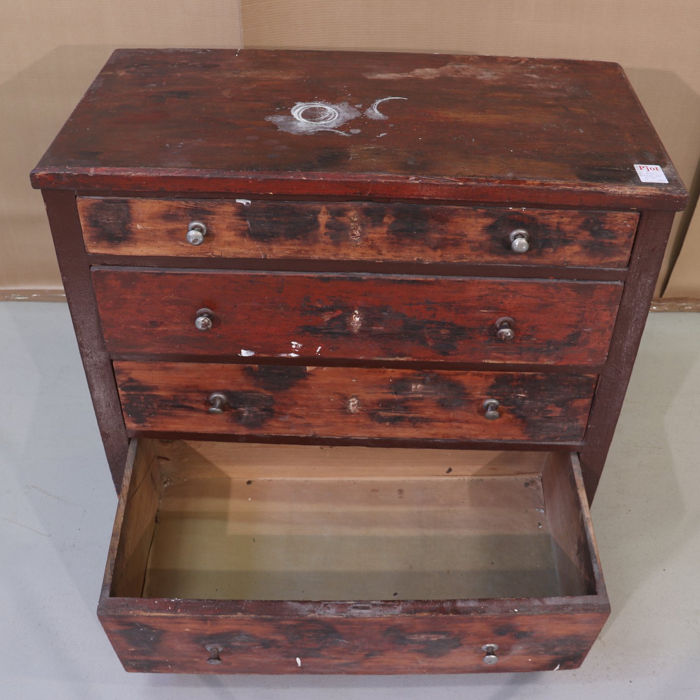 Kommode i bejdset fyrretræ m. 4 skuffer, OBS diverse defekter, (HxBxD 88x92x45 cm), 1900-1910 Emne nummer: 42217
