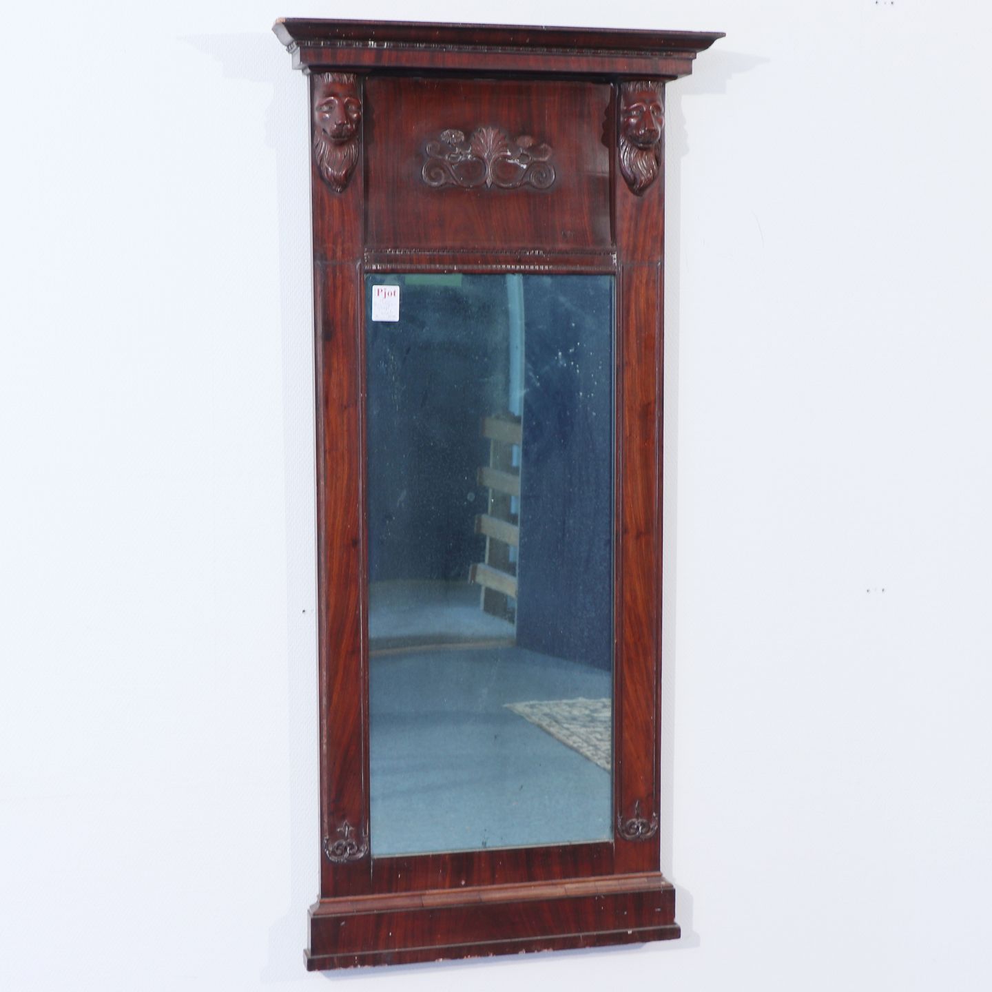Spejl i ramme af fineret mahogni m. løvehoveder, OBS div. defekter, (HxB 137x64 cm), 1890-1900 Emne nummer: 42794