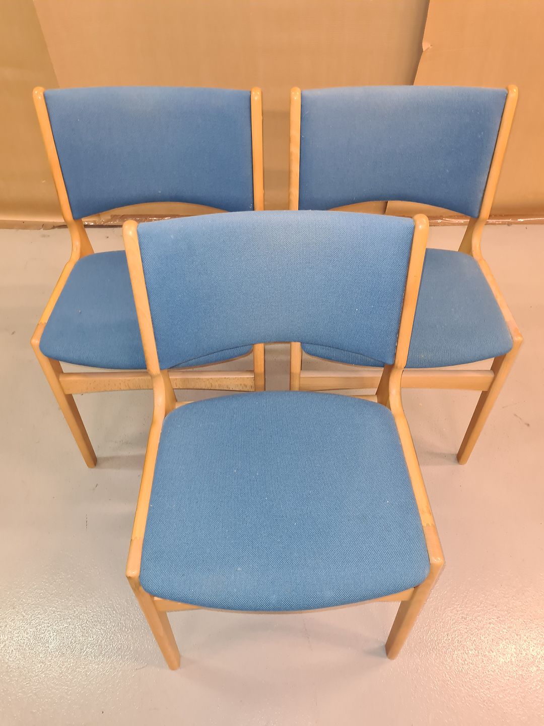 3 Spisebordsstole i bøgetræ med blå sæde og ryg fra 1960´erne. Fremstår lettere solskinsfalmet på ryg. HxBxD 78x48x54 cm. Siddehøjde 46 cm. Emne nummer: 60377