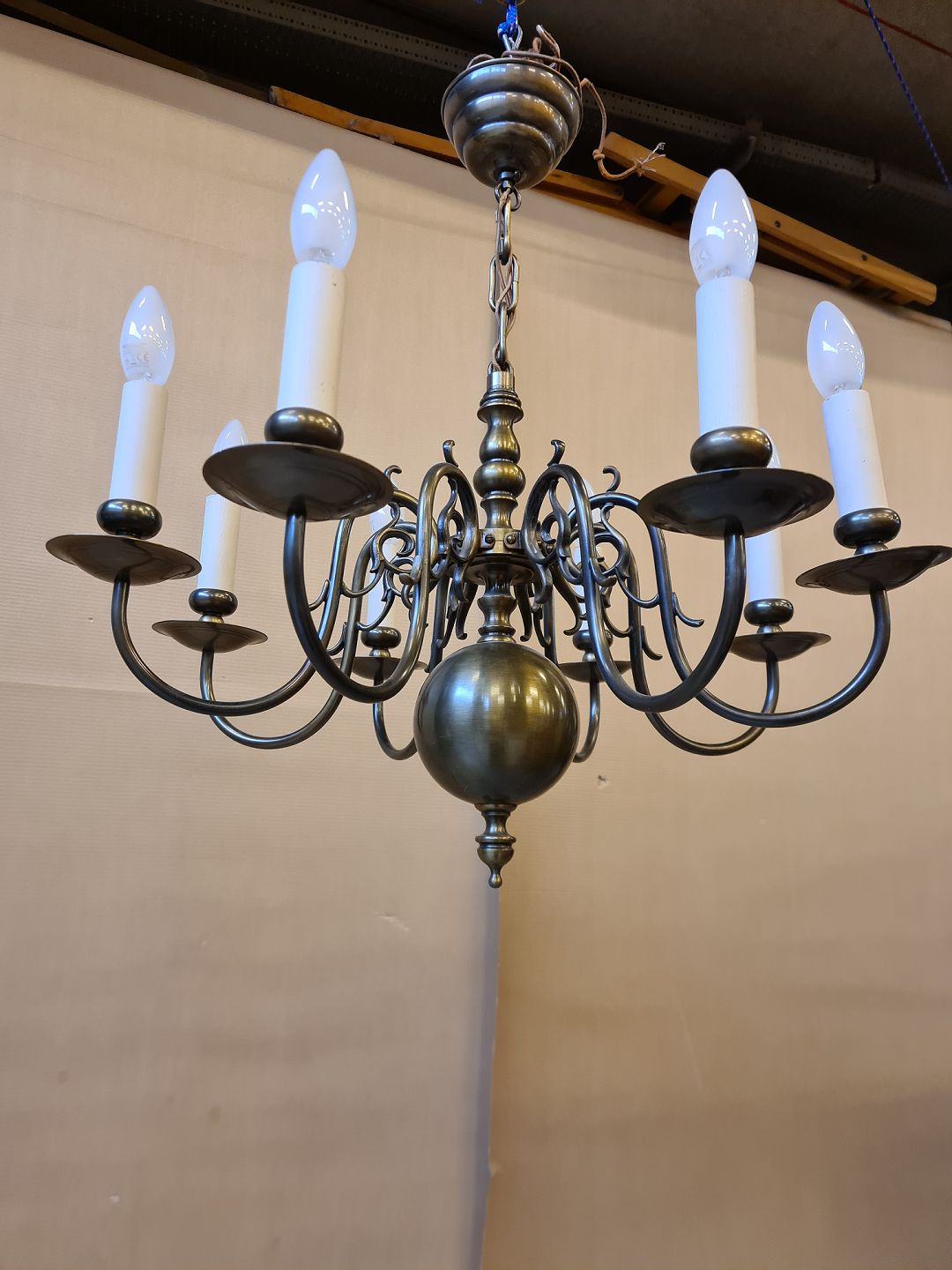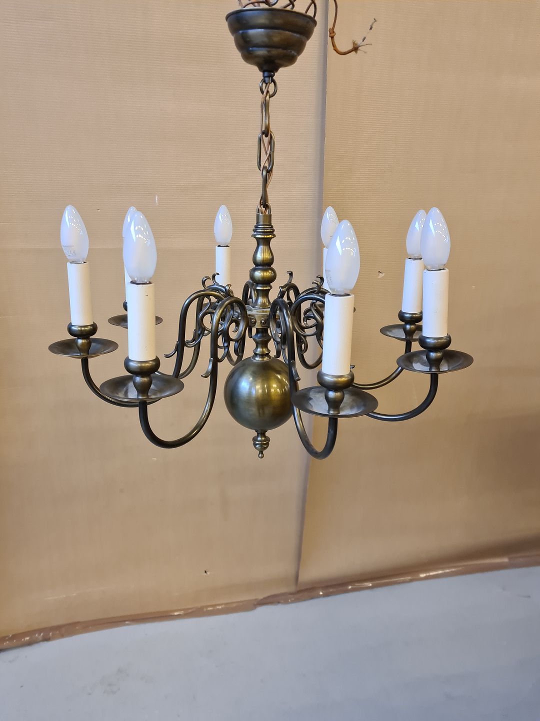 Kirkekrone i bruneret messing fra 1930erne. Højde 65cm Diameter 60cm Ledningen i kæden skal skiftes. Emne nummer: 70441