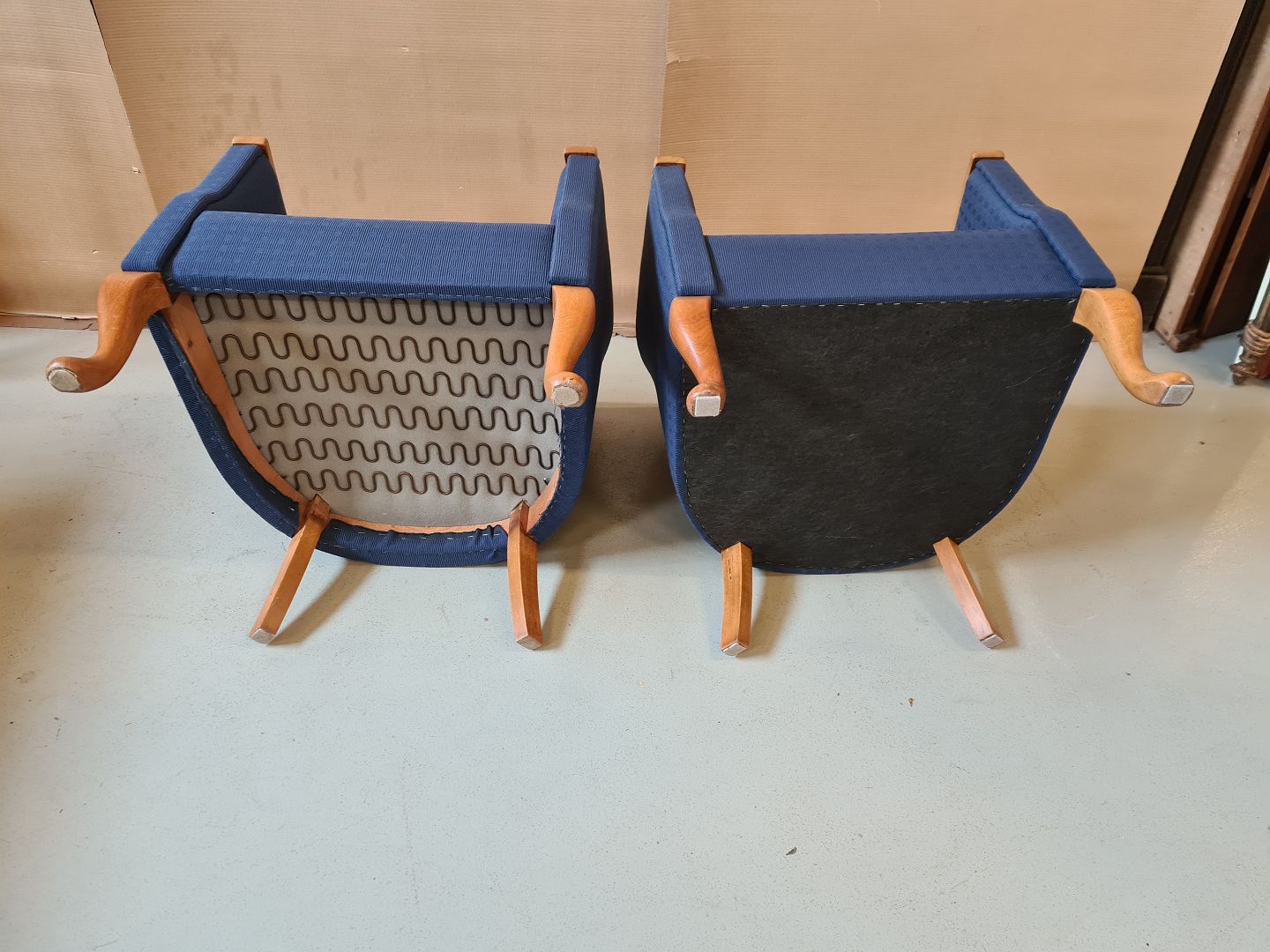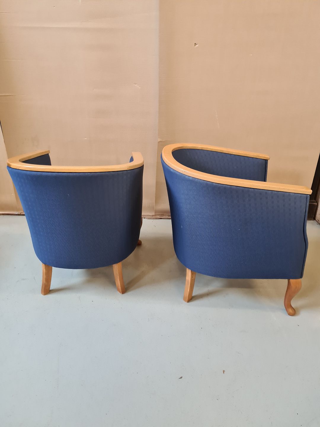 1 Lænestol med kant af egetræ og blåt betræk , fra 1980erne. Højde 76cm Sædehøjde 41cm Emne nummer: 70752