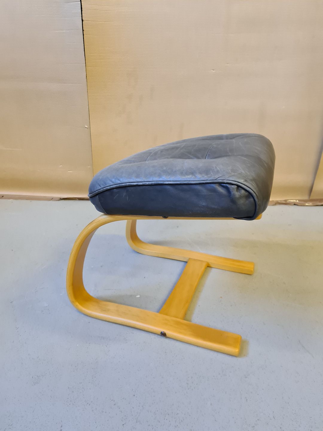 Læder skammel i bøgetræ fra 1990erne. Den har brugsspor.