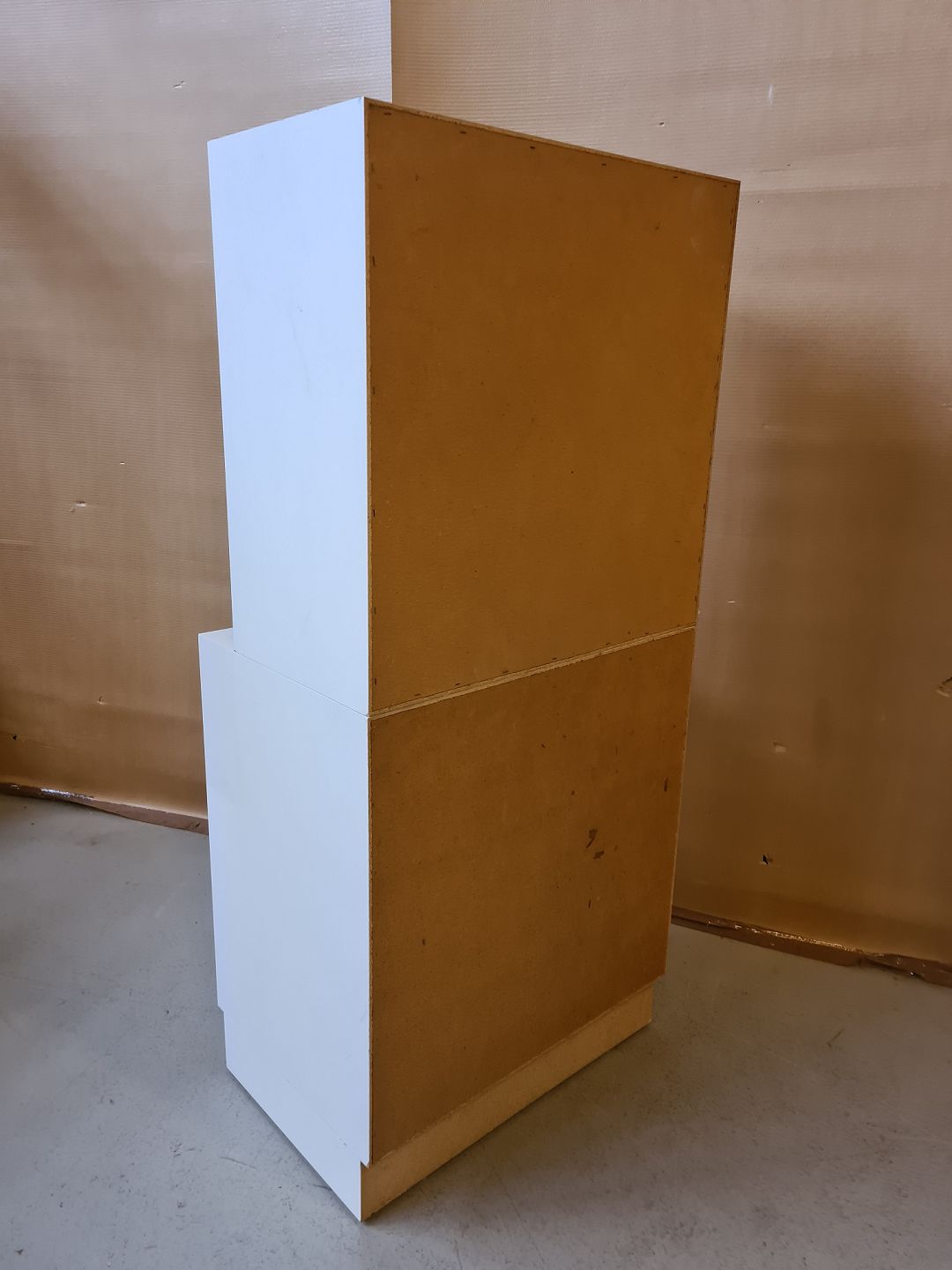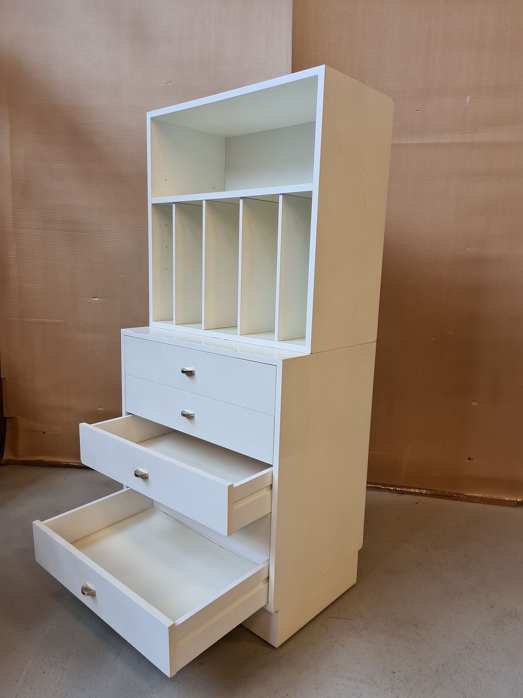 Reol med skuffer i hvid laminat fra 1990erne.