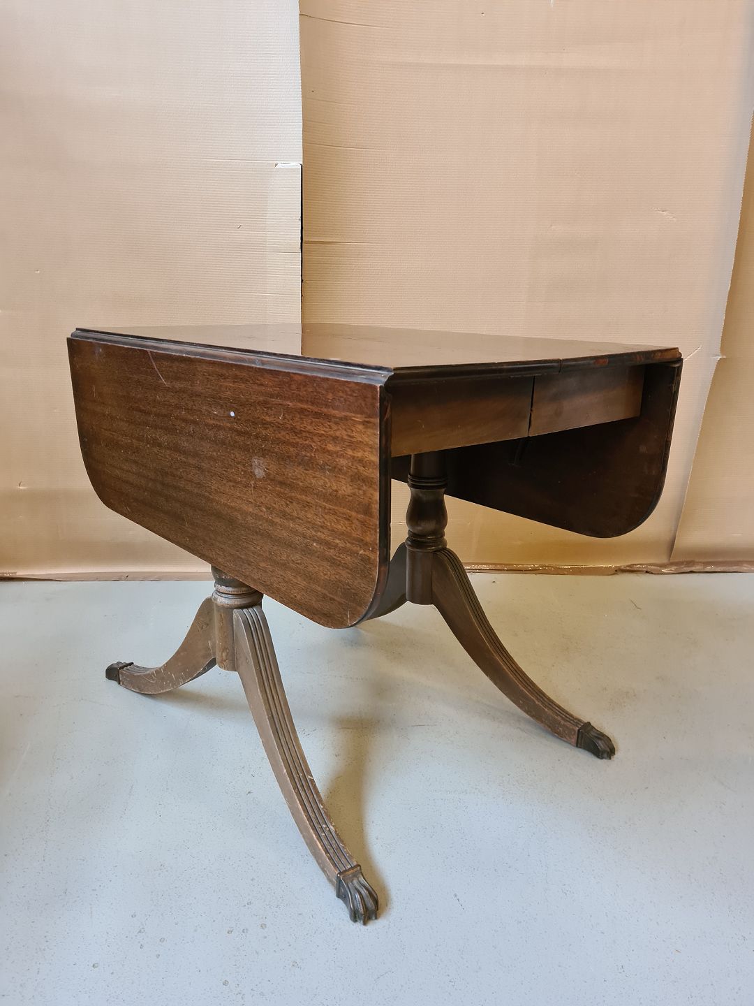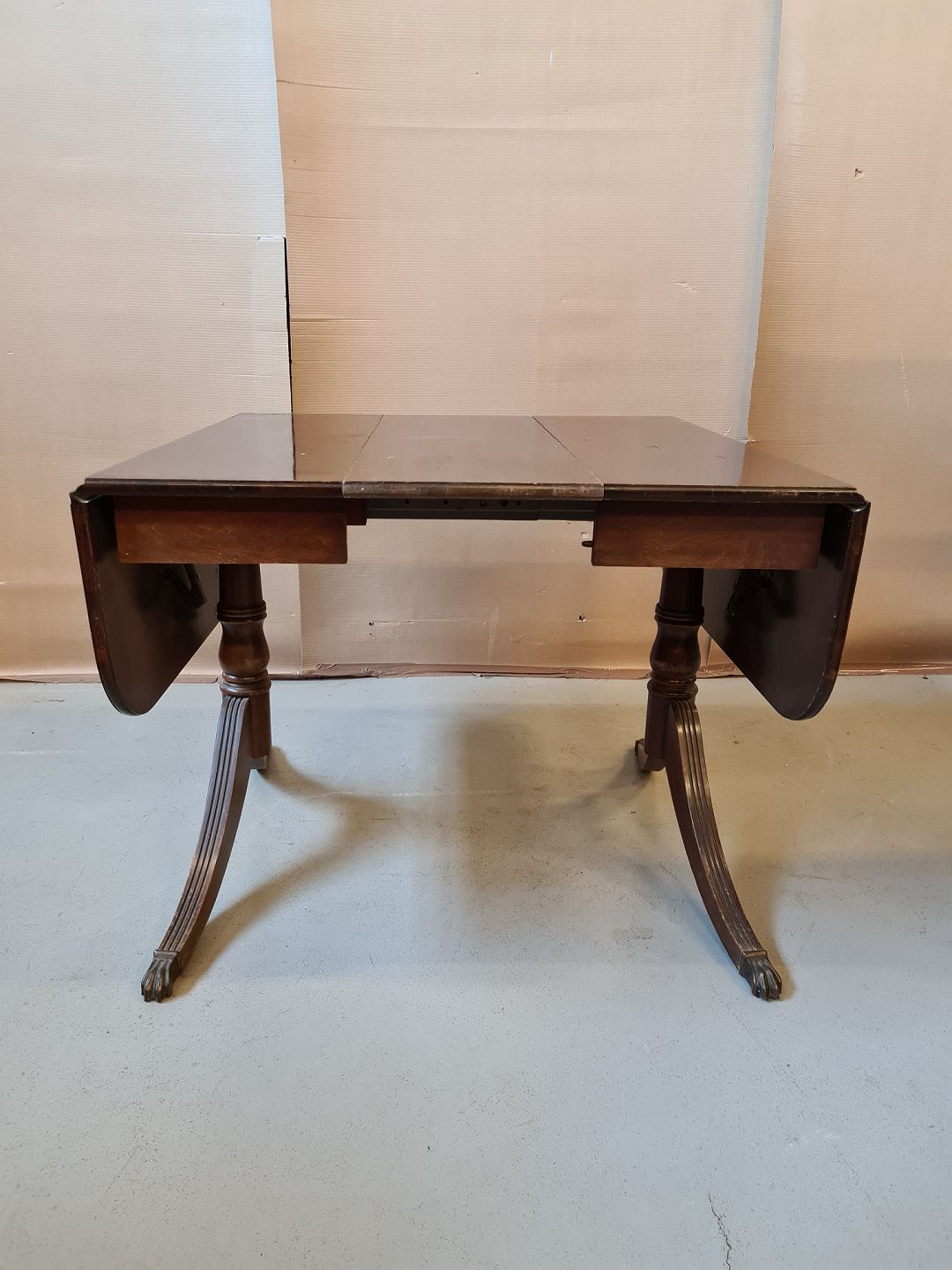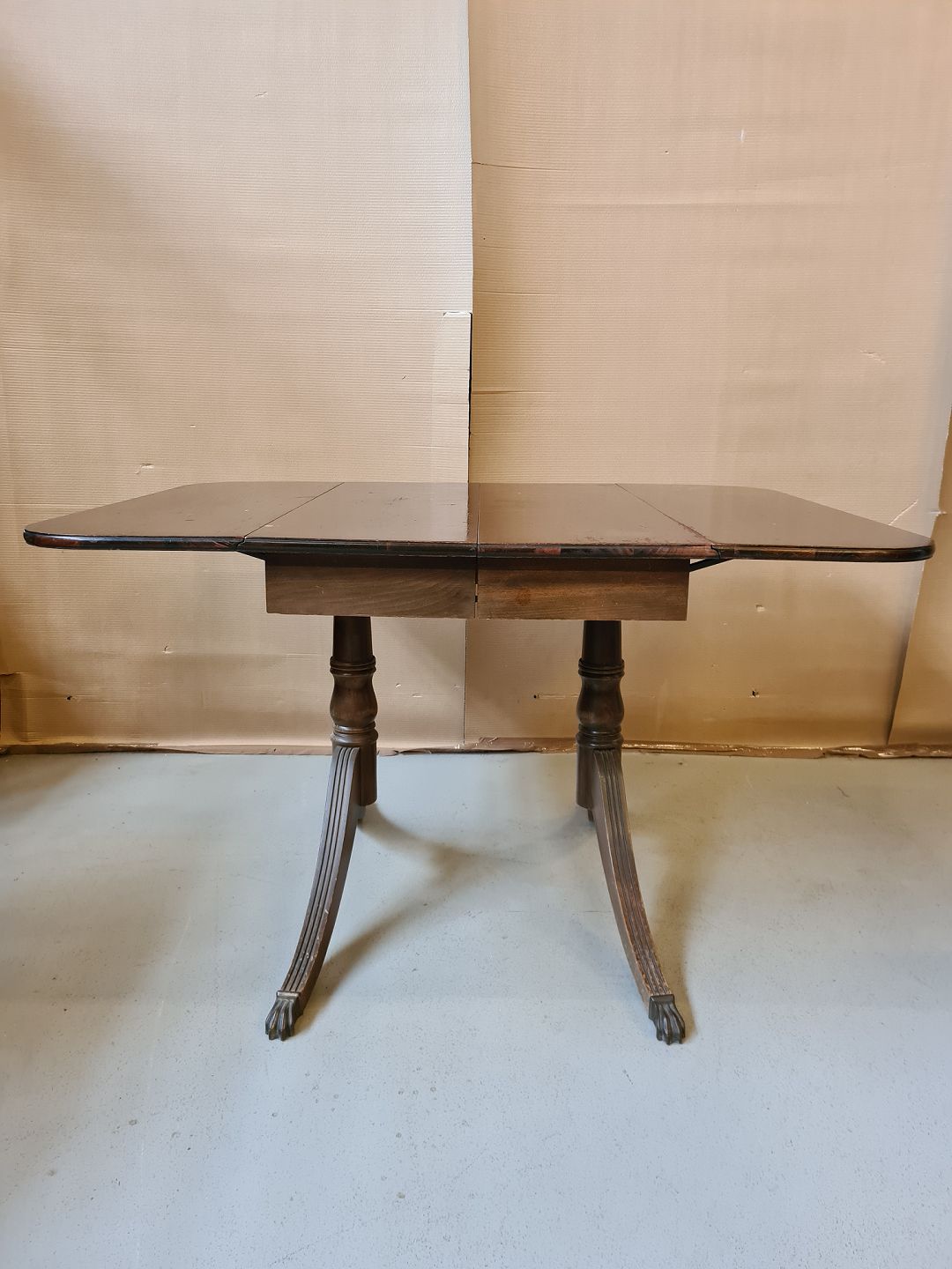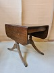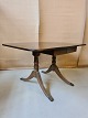Salonbord i fineret mahogni fra 1980erne. Pladen trænger til en kærlighånd. H 74cm B 91cm L 63cm Længde med klapper 122cm tillægsplade 30cm Emne nummer: 70971