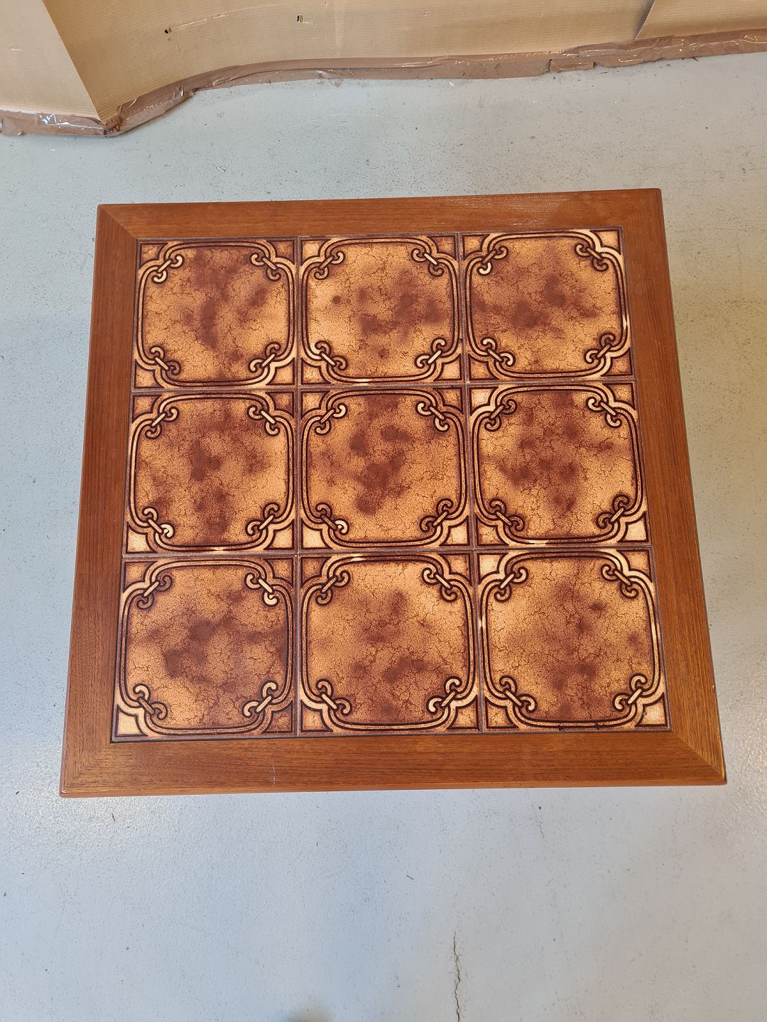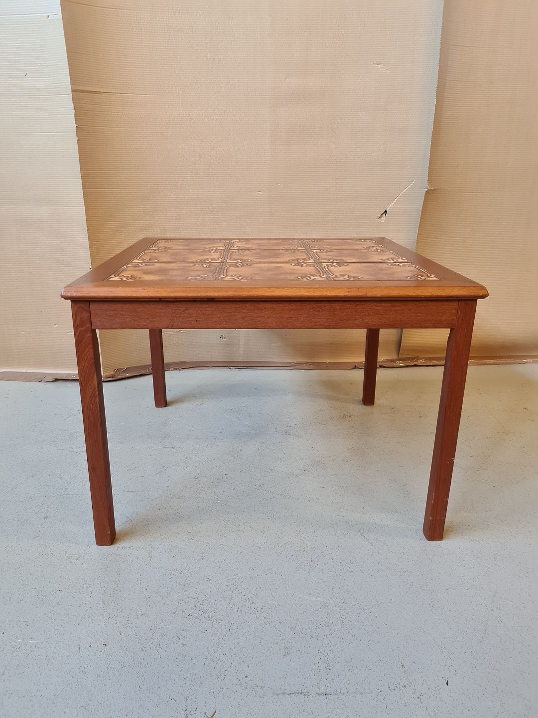 Sofabord i fineret teaktræ med kakler fra 1960erne.