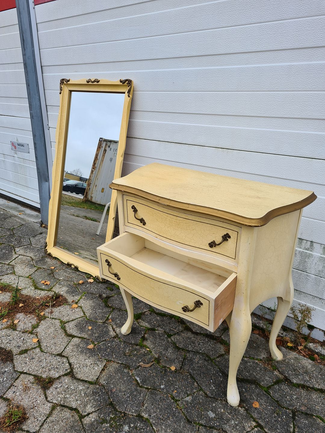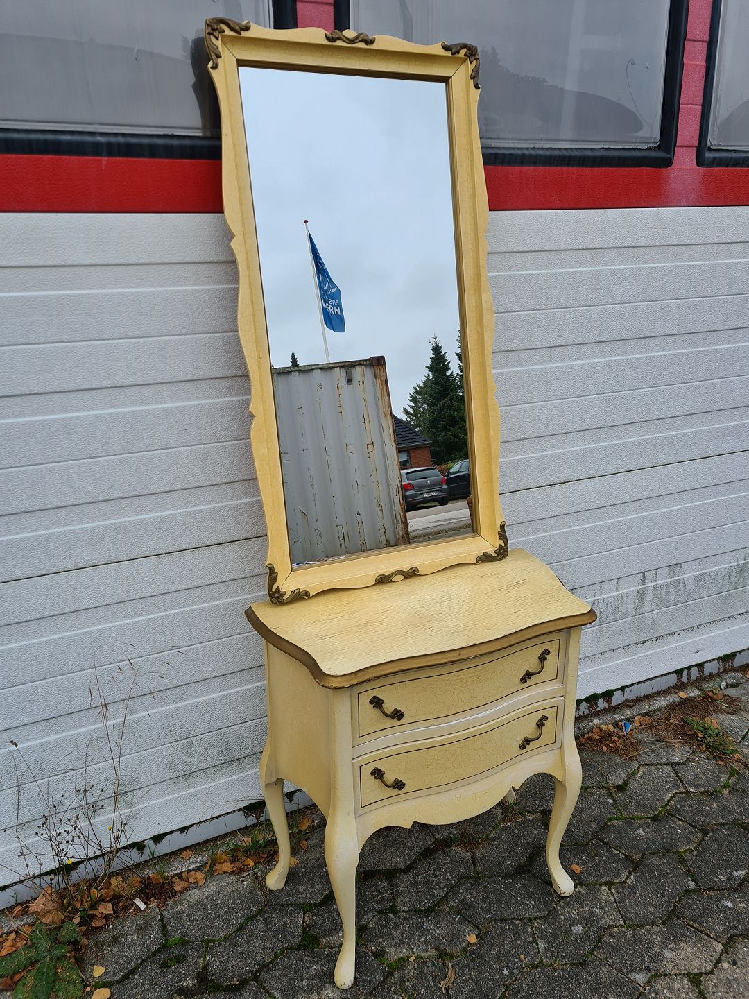 Malet spejl og konsol fra 1980erne. Spejl : H 95cm B 49cm Konsol : H 62cm B 69cm D 22cm Emne nummer: 71444