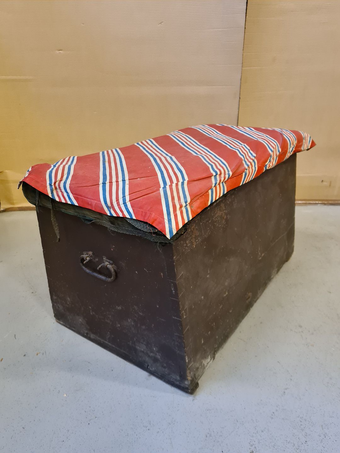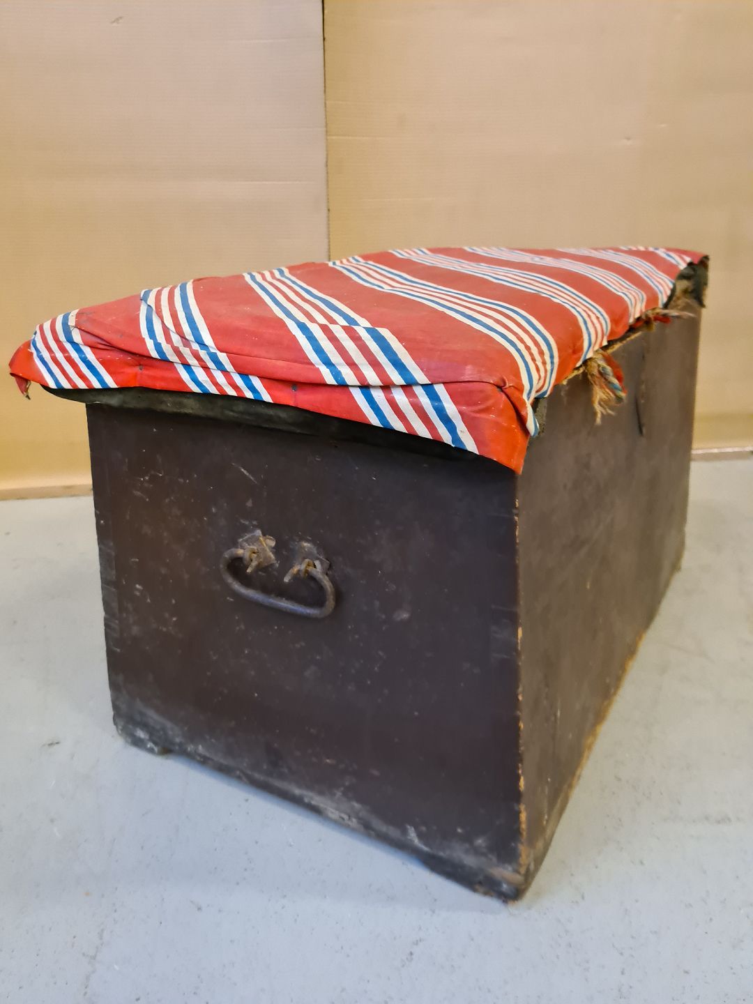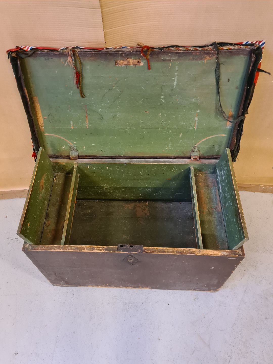 Kiste i fyrretræ fra 1900erne. Den har brugsspor og små defekter. H 44cm B 82cm D 43cm Emne nummer: 71581