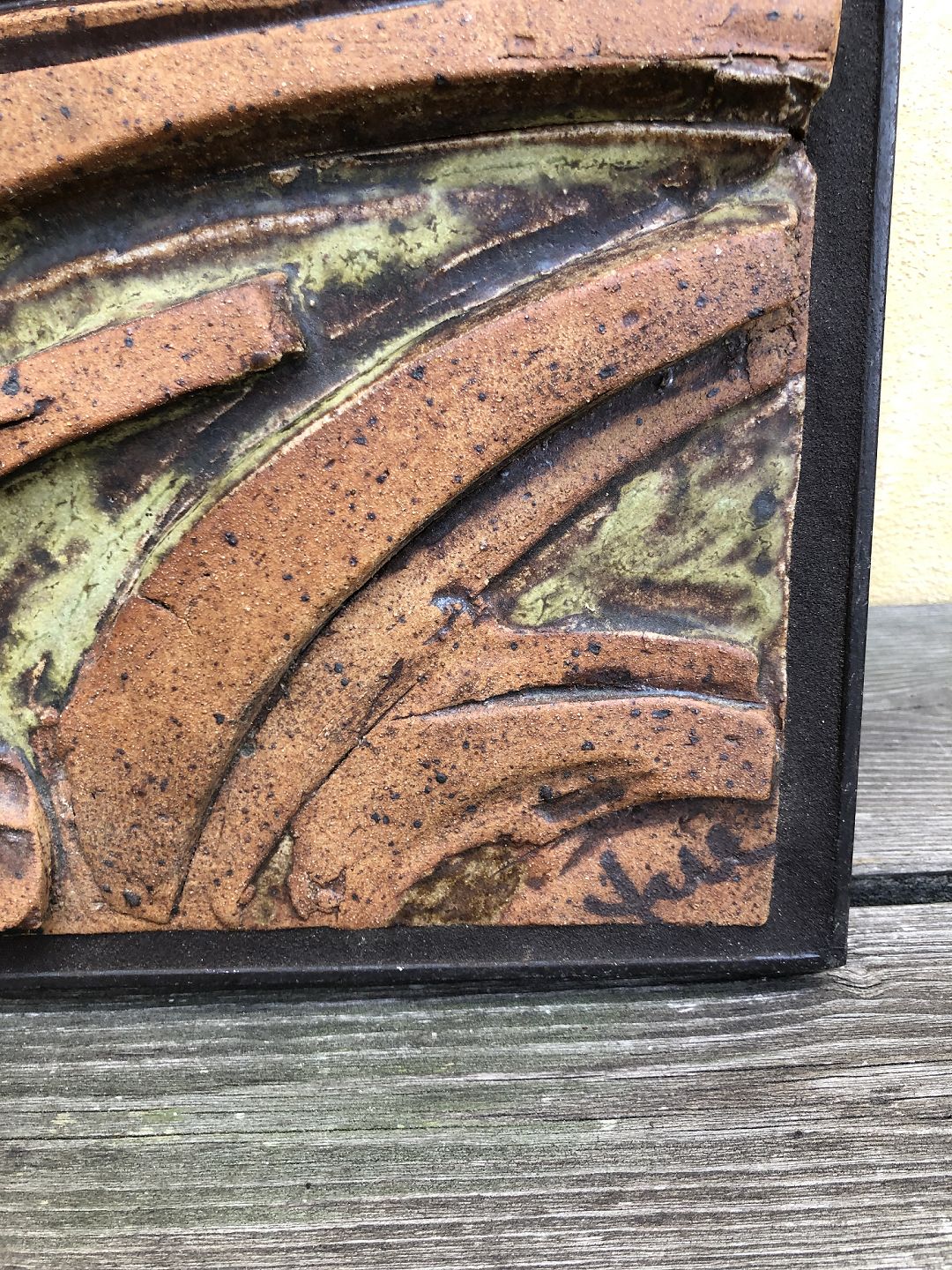 Væghængt unika relief i glaseret stentøj udført af Tue Poulsen. Formentligt fra 1970'erne. Original stand. Sign. Tue. Mål: 40x60 cm. dybde ca. 11,5 cm. Emne nummer: 80063