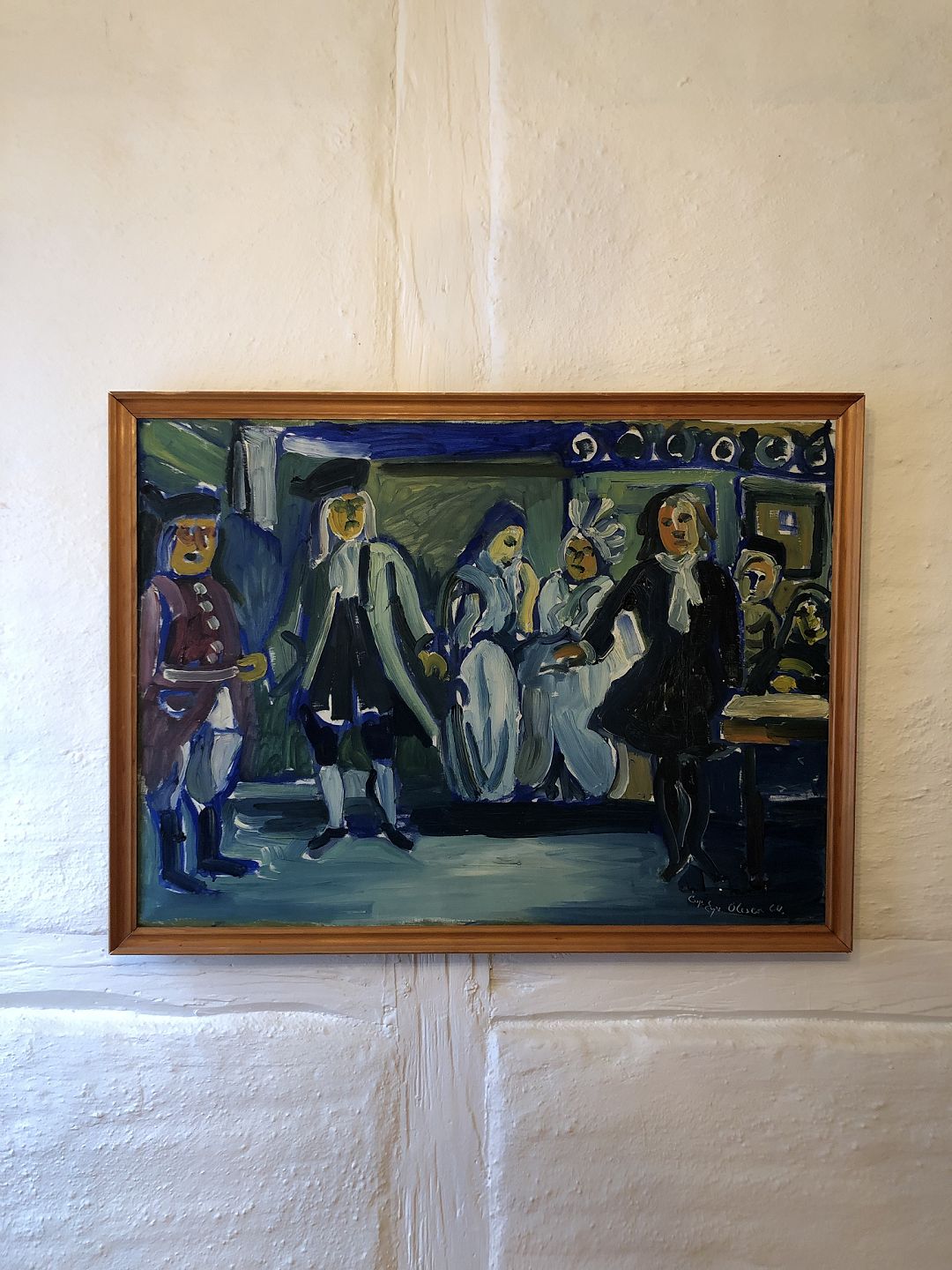Eyvind Olesen maleri olie på lærred, motiv af figurgruppe. sign. og dateret 1960. Pæn original stand. H. 71 cm. L. 95 cm. Emne nummer: 80090