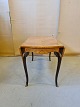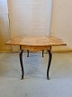 Sofabord i fineret og lakeret mahogni med intarsia af rosentræ fra 1980erne. Bordpladen har finer defekter.. H 59cm L 100cm B 50cm Brede med klapper 99cm Emne nummer: 71627