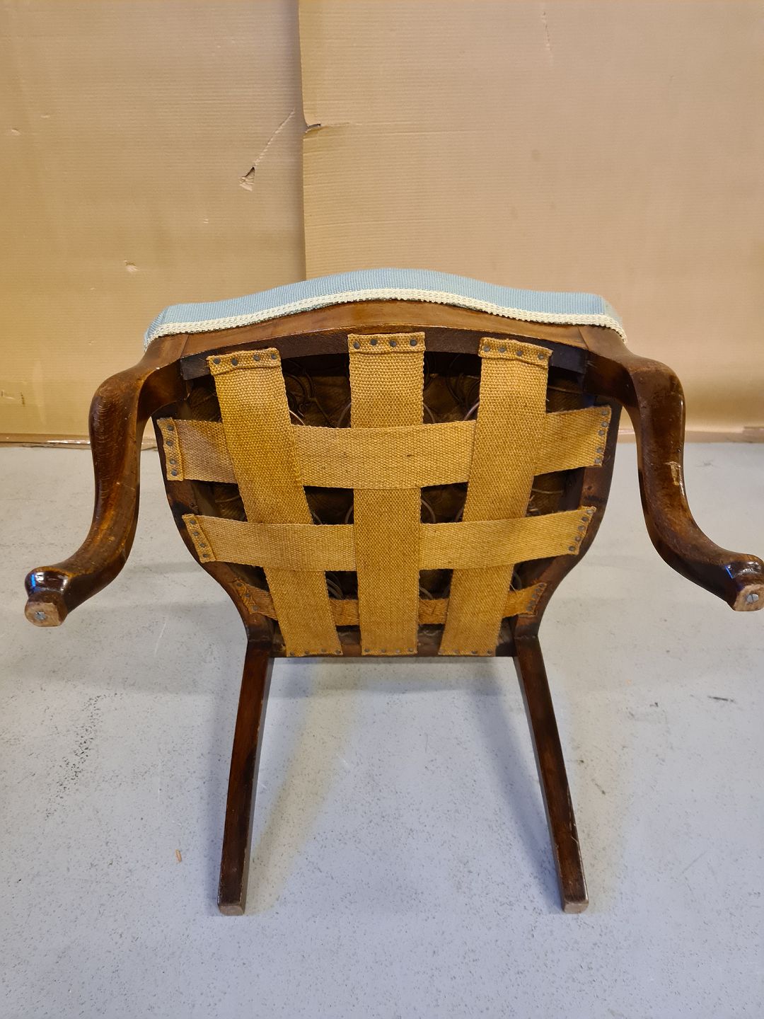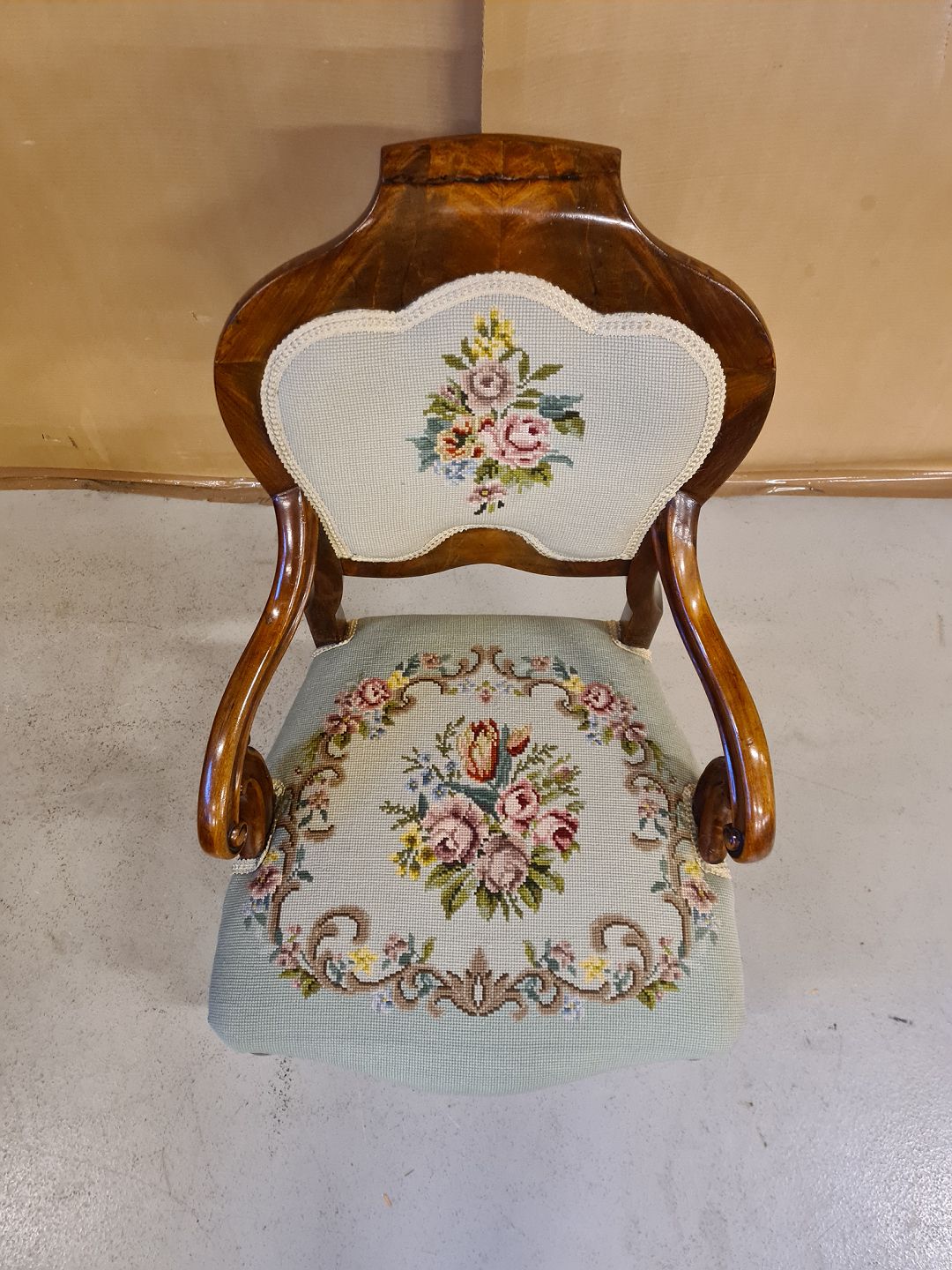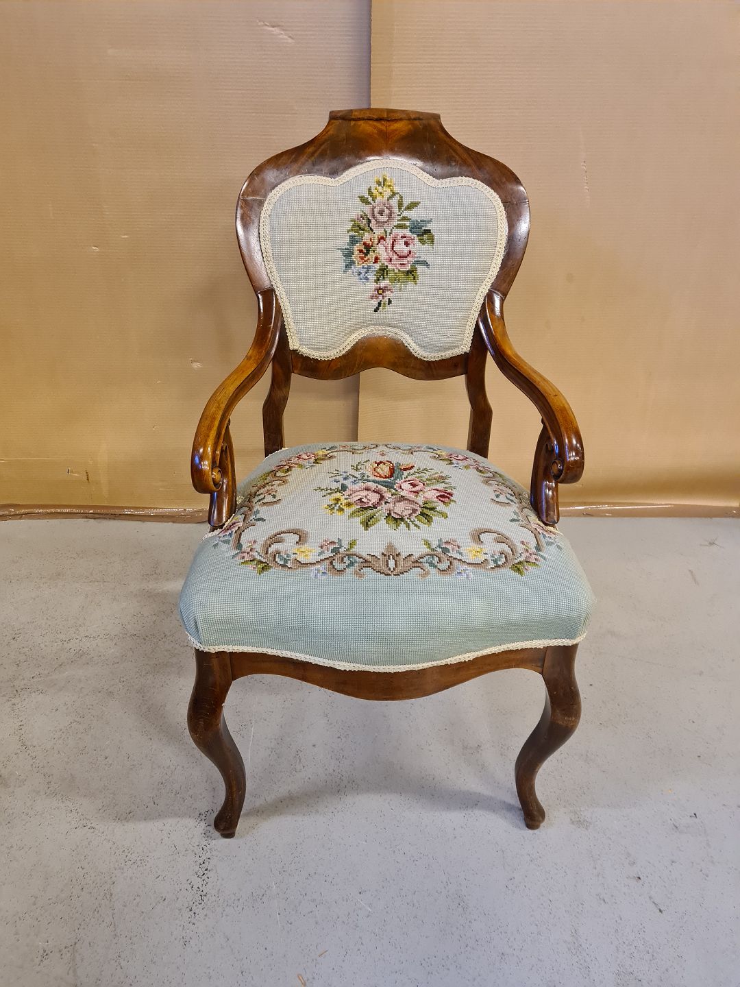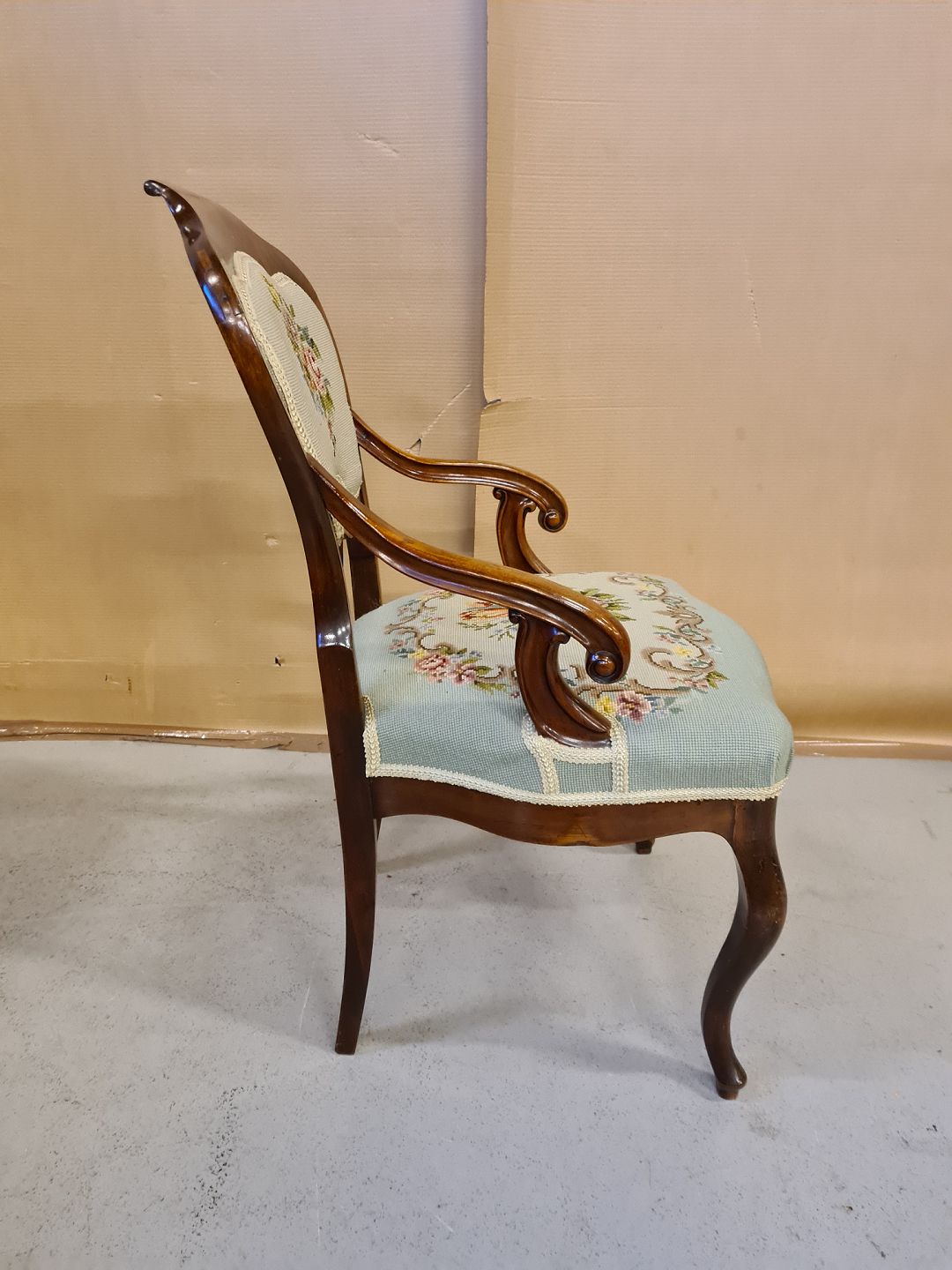 Armstol i mahogni med broderet betræk fra 1900erne.