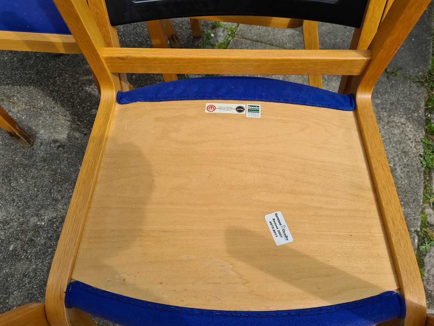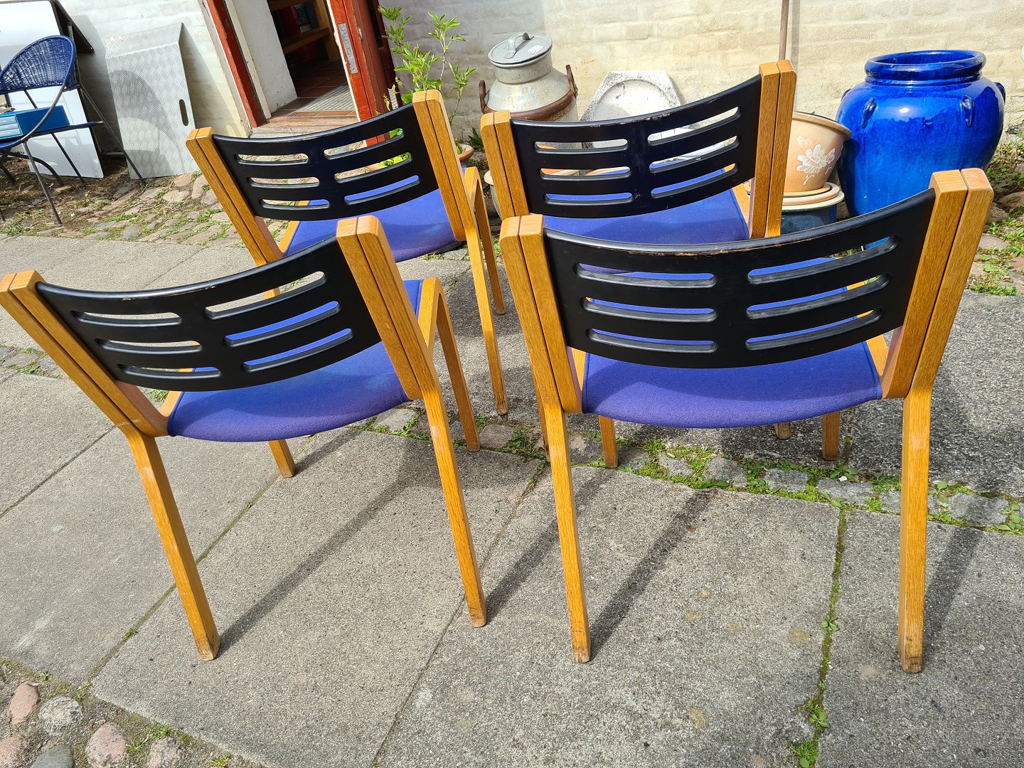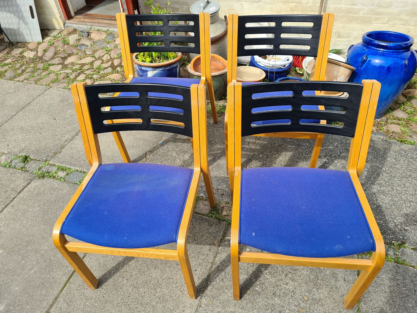 4 kontorstole i bøgetræ med sort ryg og sæde i blåt stof designet af Magnus Olesen. Fremstår gode og stabile dog med lidt brugsspor på et par af sæderne der kunne trænge til en rens. HxBxD 76x54x54 cm. Siddehøjde 46 cm. Emne nummer: 80209