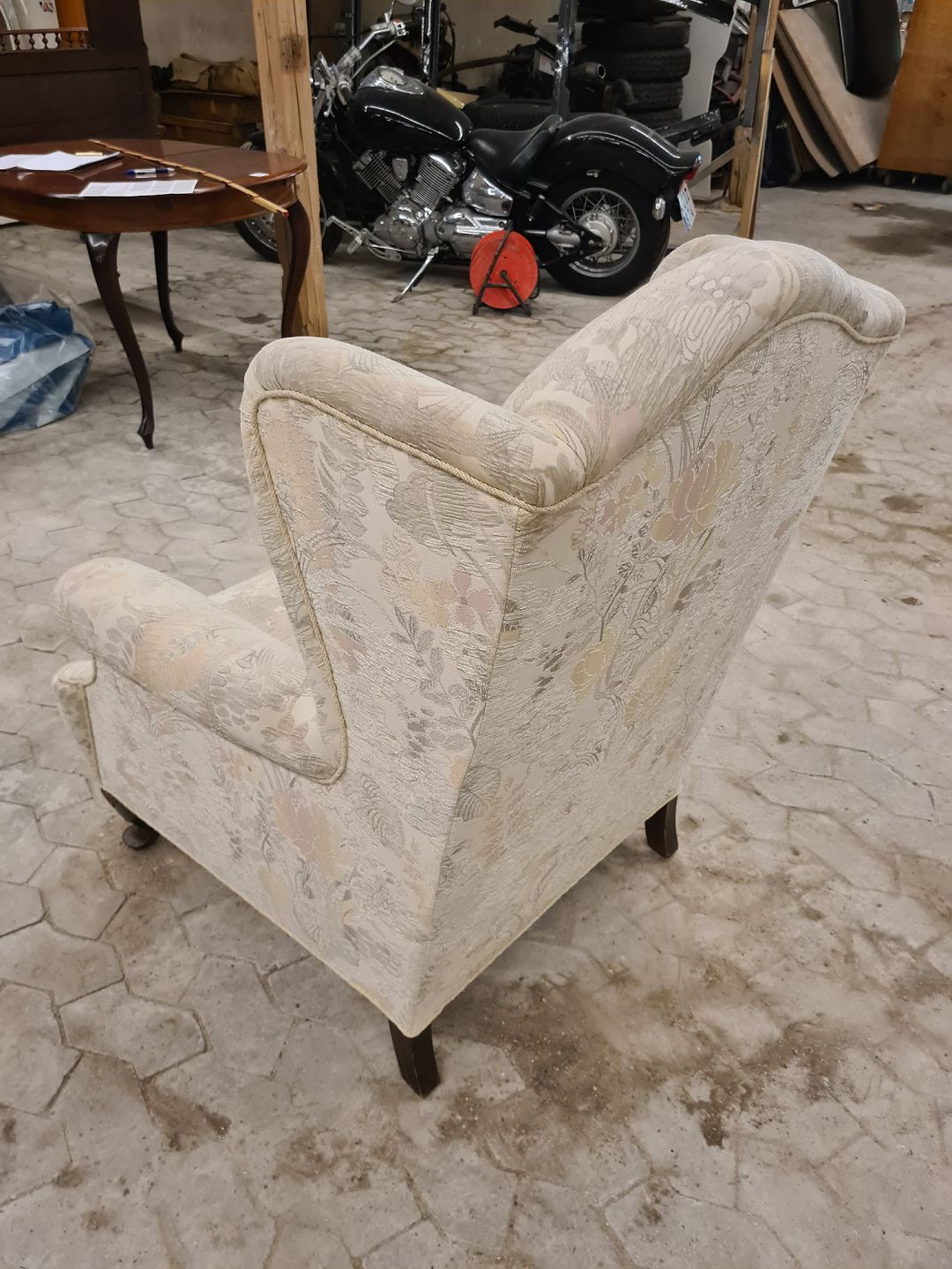 Lækker overpolstret lænestol, med flotte udskæringer på de to forreste ben. lænestolen fremstår i flot stand med få tegn på slitage af polstring. Anno: 1920-1930 HxBxD - 108x83x95 Sædehøjde - 40cm Emne nummer: 90046