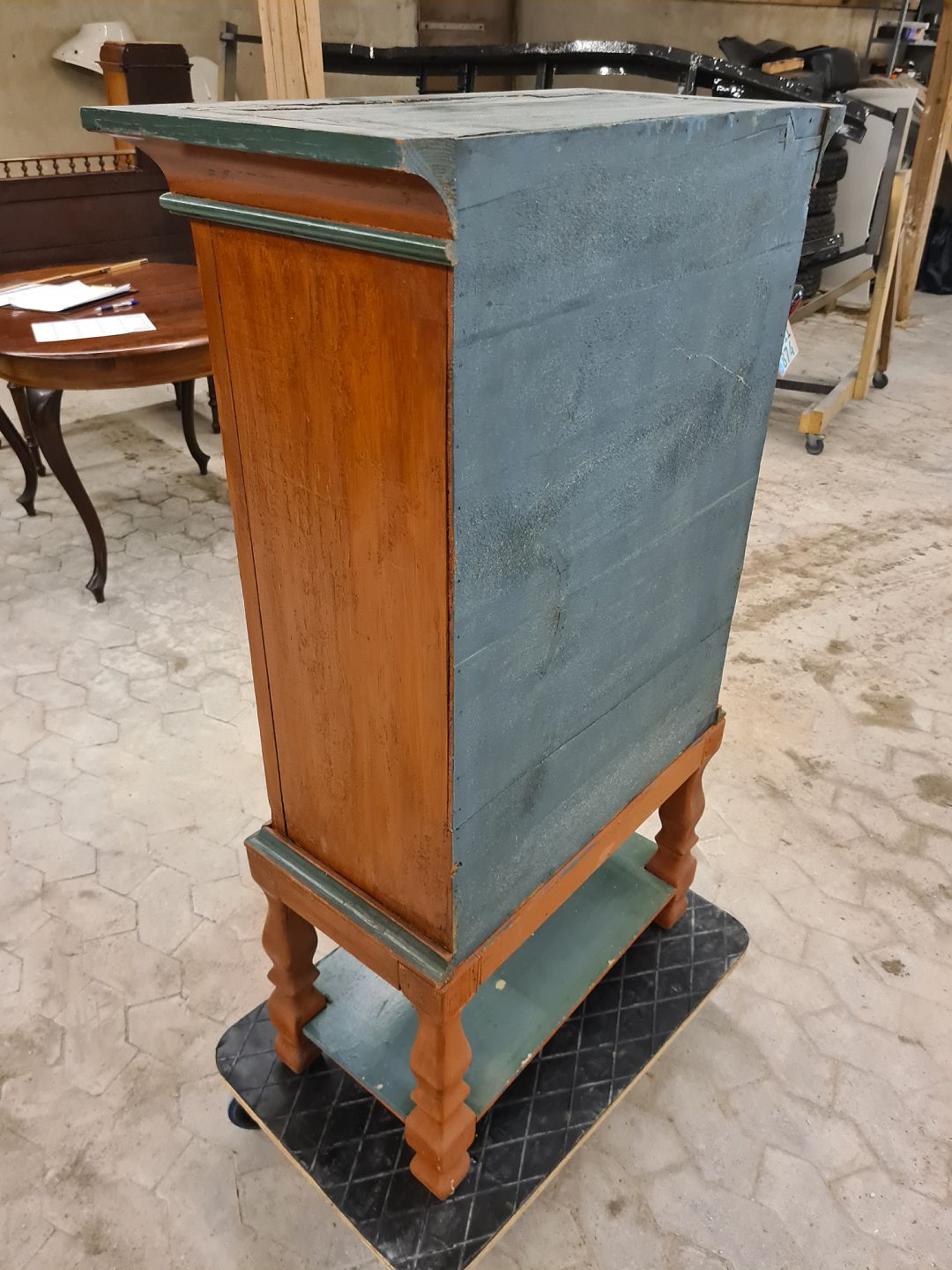 malet skab anno 1785. Skabet har en låge og skuffe udsmykket med en flot blåtmalet bagrund med blomster på . HxBxD- 123x69x35 Emne nummer: 90052